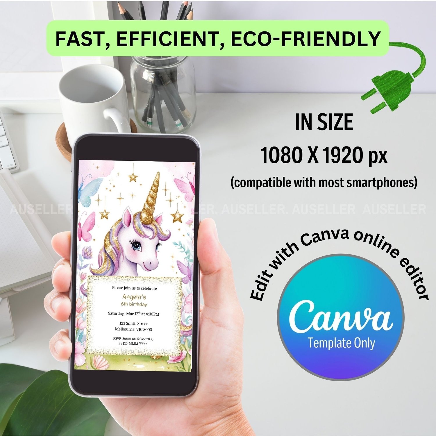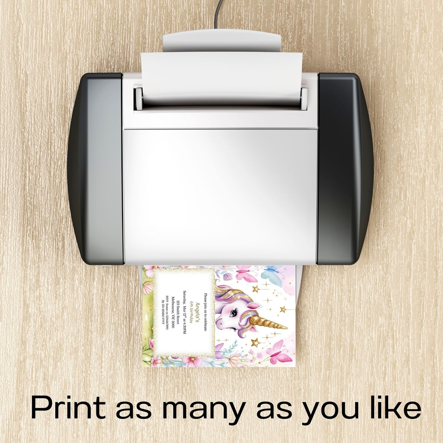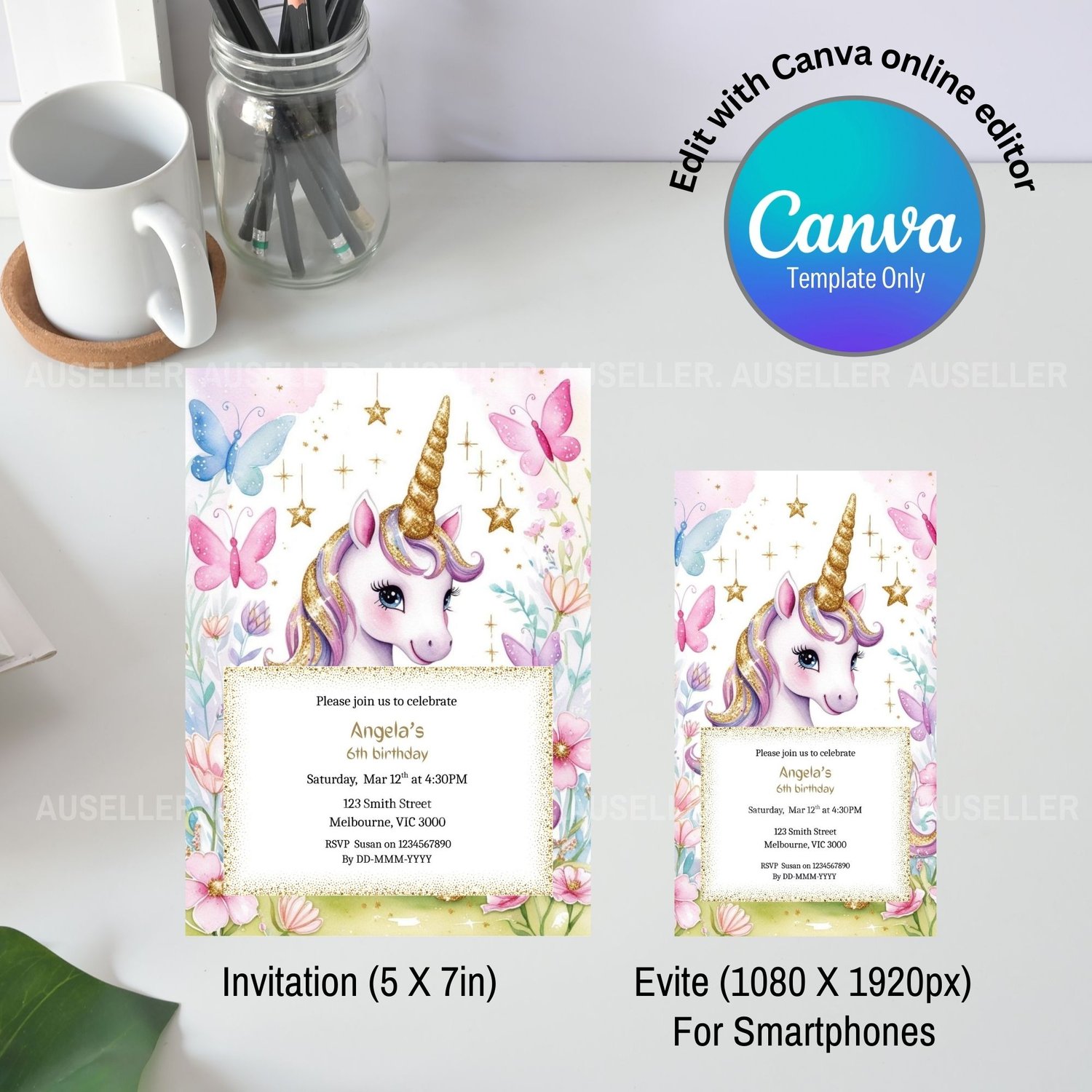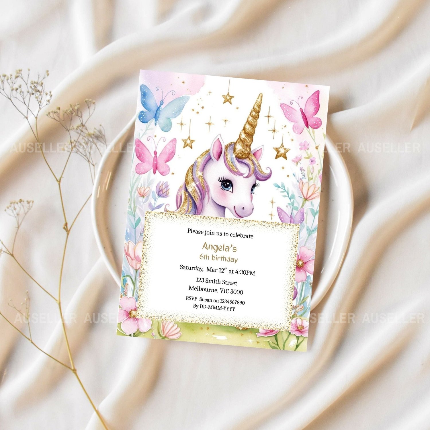 Invite your little one’s friends to a truly magical celebration with this enchanting unicorn invitation! Featuring a sweet unicorn with a sparkling gold glitter horn and a big, happy smile, this design is full of charm and wonder. The background twinkles with gold glitter stars, pastel-coloured flowers, and fluttering butterflies — creating the perfect fairytale scene. This invitation is designed especially for girls who love all things whimsical and sparkly. A dreamy way to set the tone for an unforgettable party!