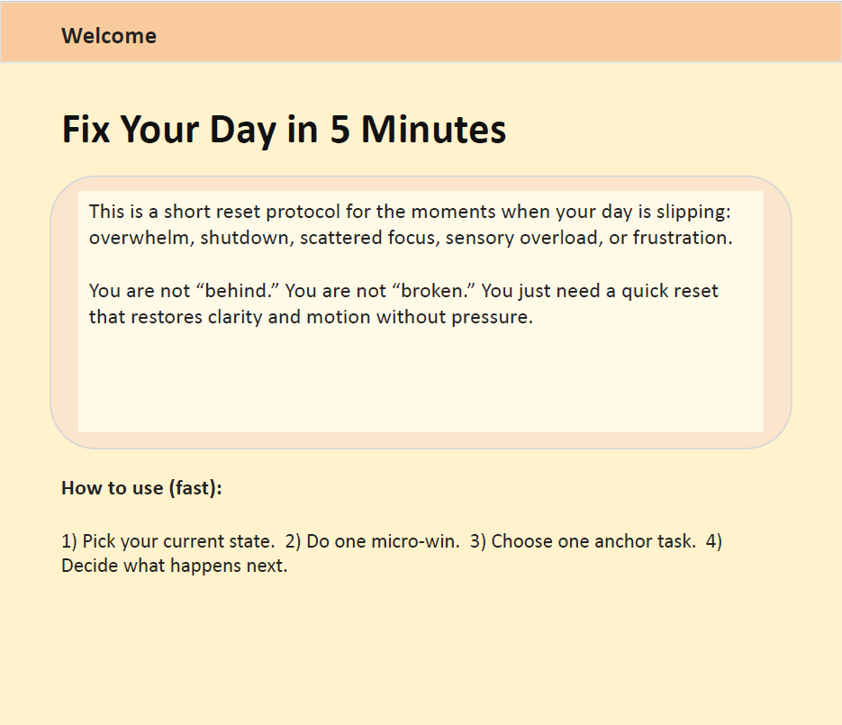 Fix Your Day in 5 Minutes is a tiny, repeatable reset for overwhelmed minds. It’s designed for neurodivergent creators (ADHD-friendly, low-friction) and anyone who needs to interrupt a spiral, regain clarity, and choose a next step without guilt.