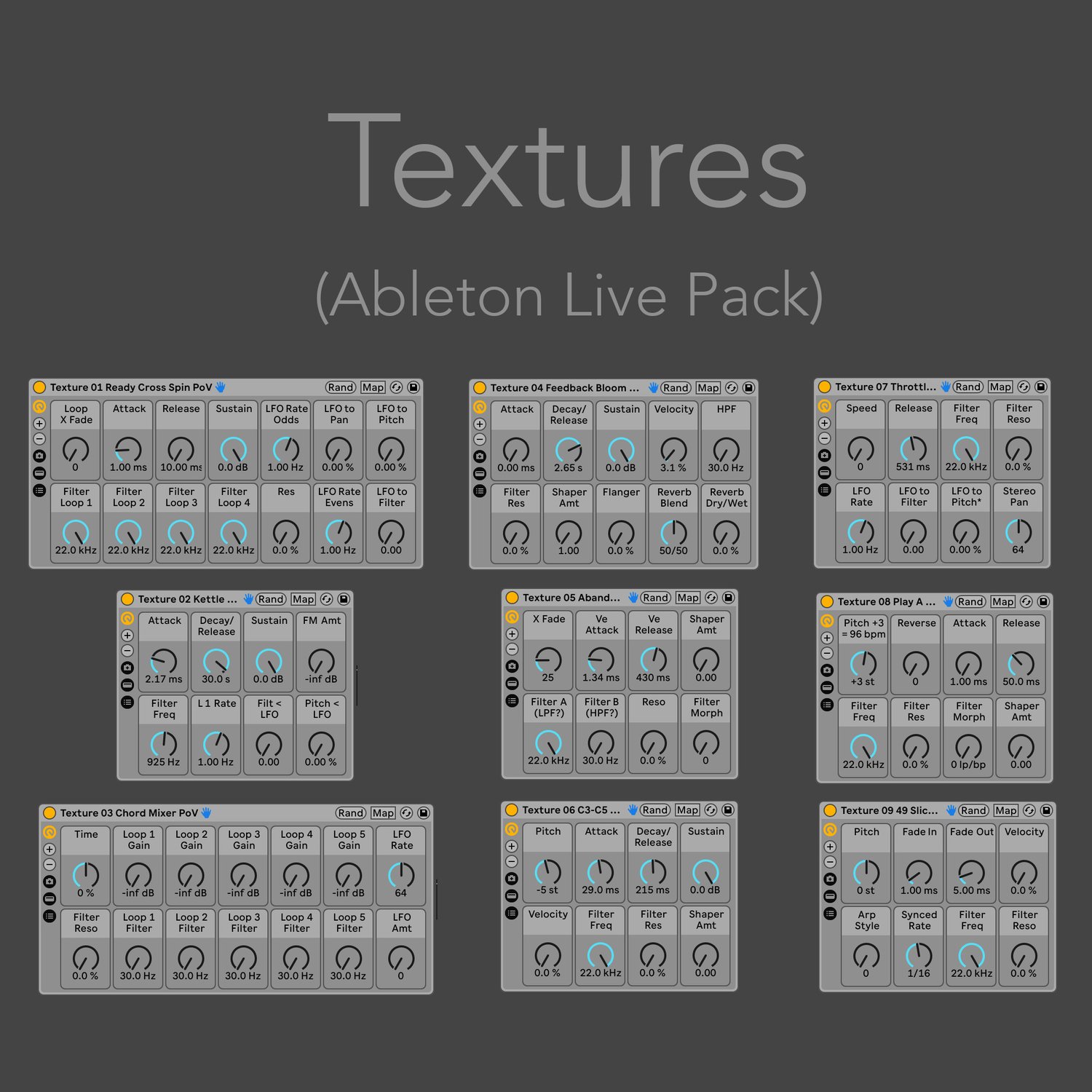 9 Textural Instrument Racks. I created 9 textural samples using synths and guitars through effects and lots of reverb. With those samples I set them up into unique racks that all behave a bit differently. These aren't your typical multi-sampled playable instruments. Instead the focus is on unique ways of manipulating the samples as background textures and soundscapes to draw inspiration from. Please refer to this video for a detailed overview: