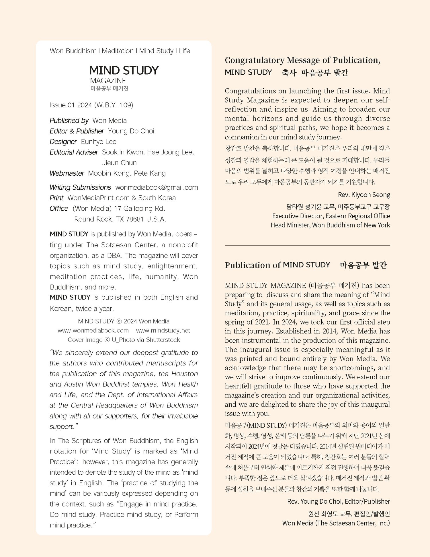 * MIND STUDY is published by Won Media, operating under The Sotaesan Center, a nonprofit organization, as a DBA. The magazine will cover topics such as mind study, enlightenment,