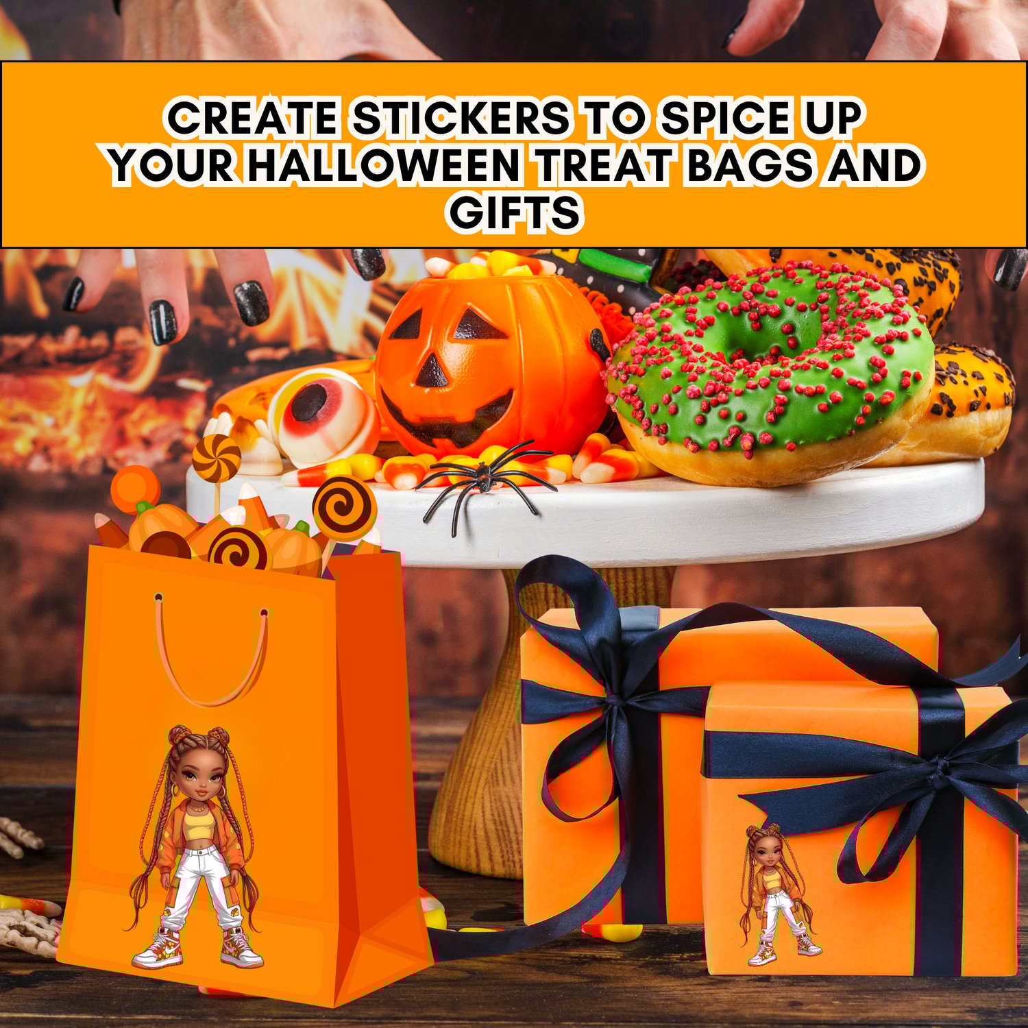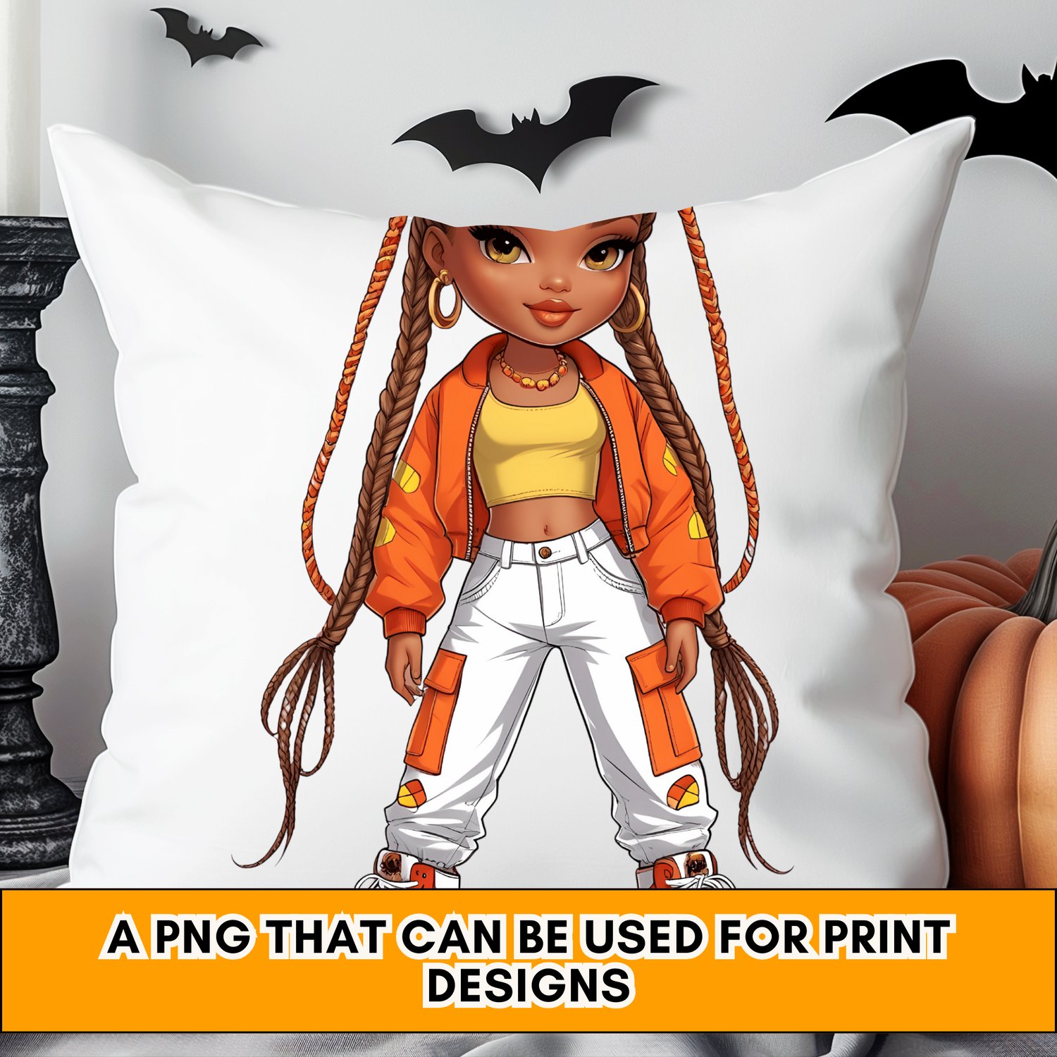 Get your hands on this trendy, high-quality clipart featuring a stylish girl ready for spooky season! Dressed in a cool orange and white outfit inspired by candy corn, this character is perfect for giving your projects a modern, fashionable flair.