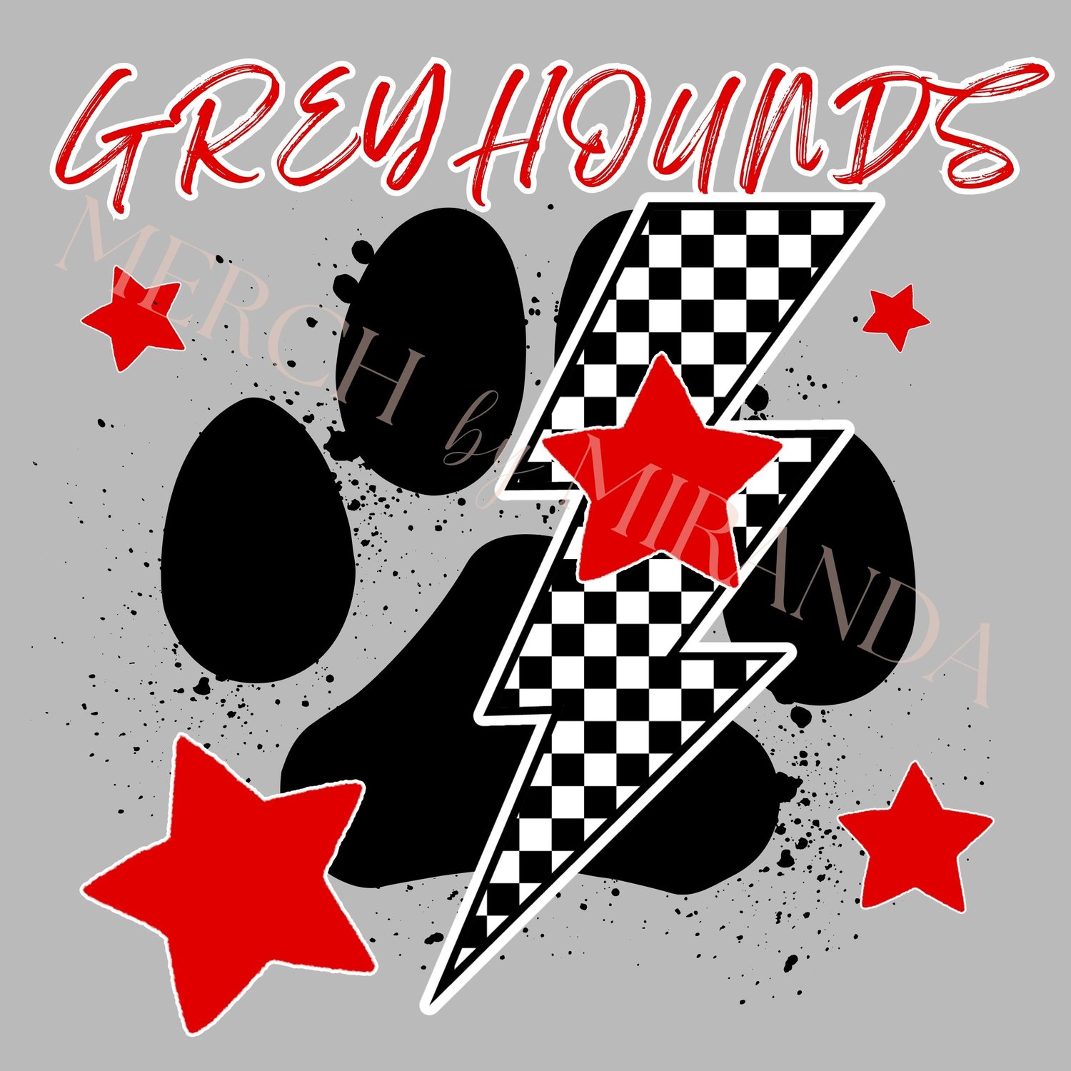 Greyhound Mascot Red | Sublimation Design | Digital Download | School Spirit Shirt PNG | DTF Design | Lightning Bolt-Checkered with Stars - Greyhounds