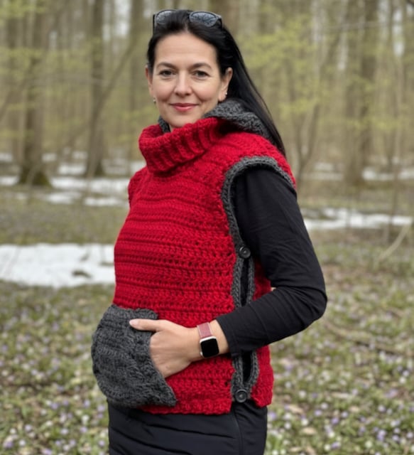 - Maximum variability: The vest is designed so that everyone can adapt it to their own taste – crochet a version with a turtleneck and pocket for colder days, or a simpler variant without them.