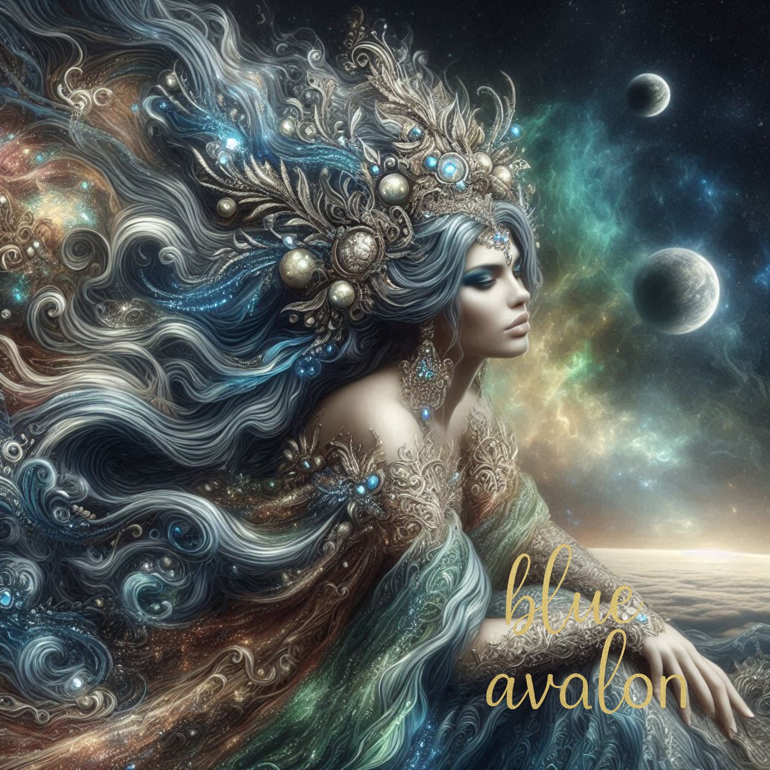 A celestial Goddess floats in space in deep contemplation. Her swirling hair and flowing robes infused with muted colours of silvery grey, gold, blue and green. Behind her are planets she watches over with power, love and grace. This ethereal artwork blends beauty, strength and cosmic wonder - perfect for lovers of fantasy, spiritual themes, or galactic art.