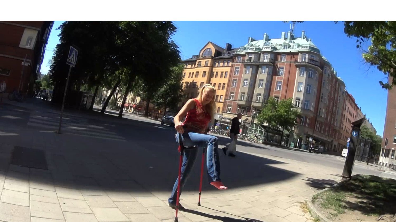 Alva is out crutching with tight jeans with wide legs, red top, a flat shoe and blonde unleashed hair.With a pink bandage on her right foot where you can see her small toes peeking out in front of the bandage, she jumps up a hill with the help of her crutches.She sits down on a bench and unfolds her trouser leg so you can see the bandage better.Alva stops and looks at the view and also corrects the bandage on her sprain foot in a close-up.