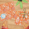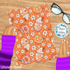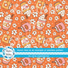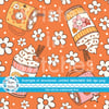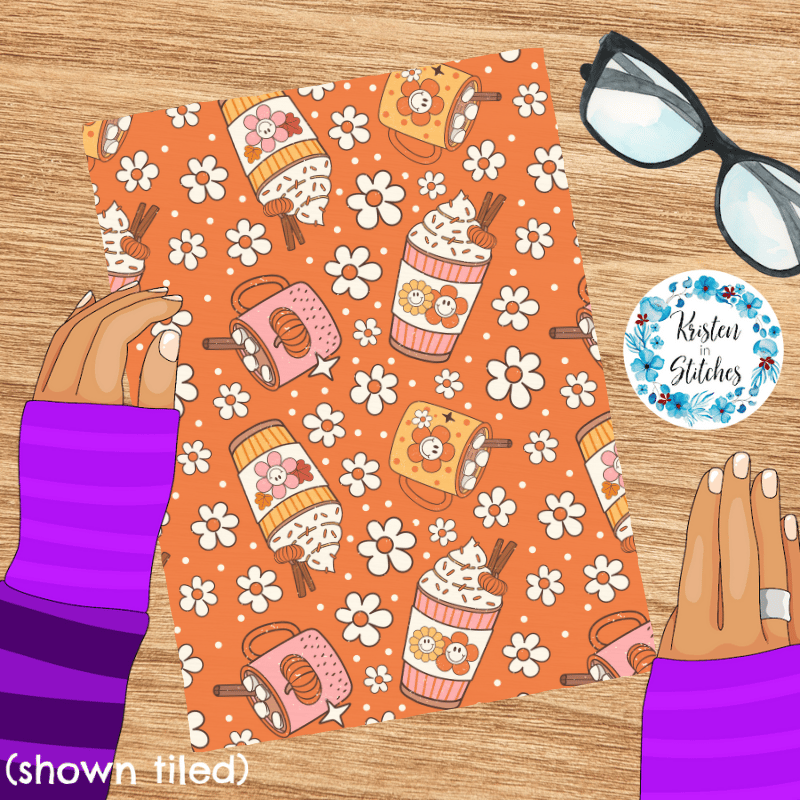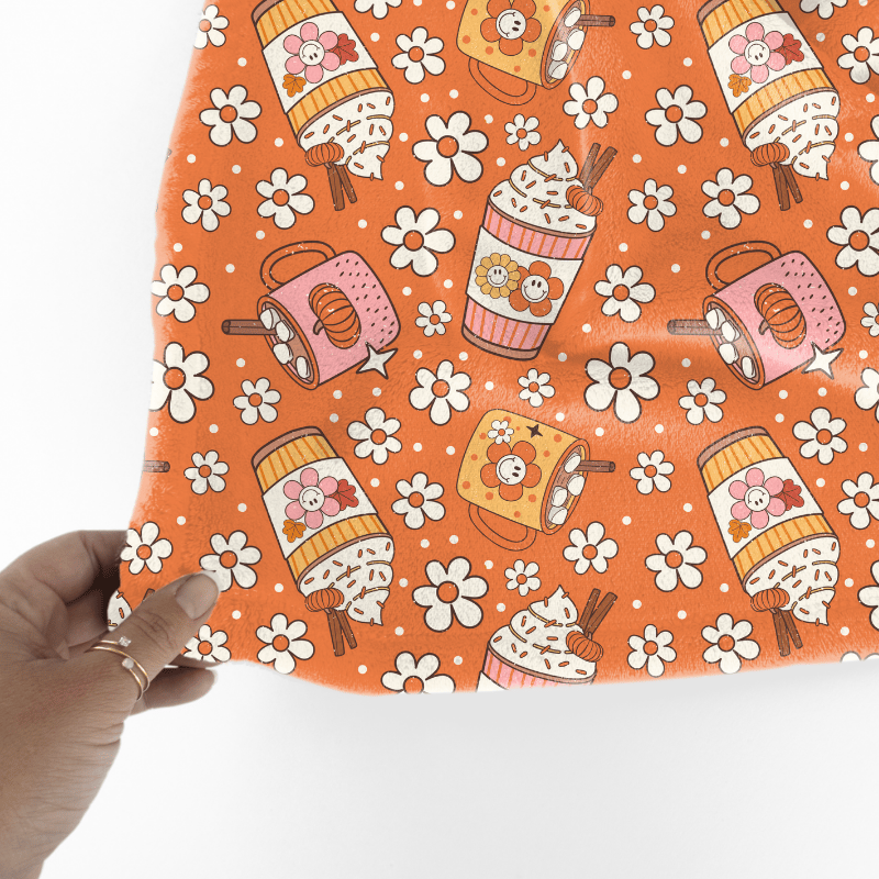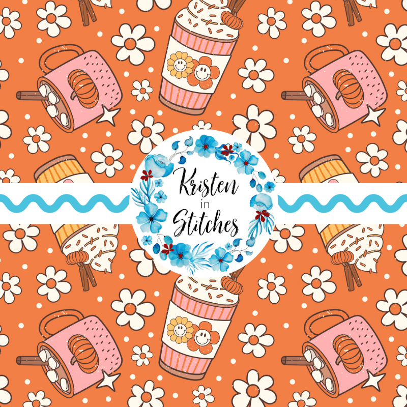 Pumpkin spice coffee and cocoa drinks with retro fall flowers on harvest orange.