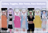 Colors: Hair Color Wheel (White-Blonde-Black) │ 4 Hue Shifts (Outfit, Eyes, Hair, Hair Emission) │ 3 RGB cycle modes (Outfit, Eyes, hair Emission) │Outfit Saturation Wheel │ White-Black Outfit swap │ Silver-Gold Metal swap │ 2 Extra Skintones included! Just drag & drop on model