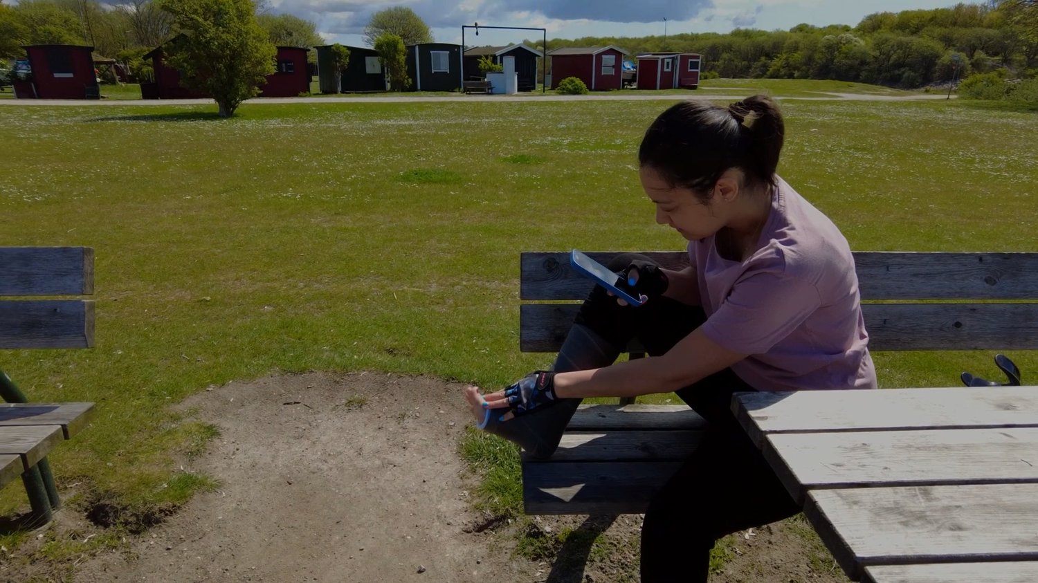 She sits down on a bench to rest and take up her phone and starts taking photo of her casted leg.