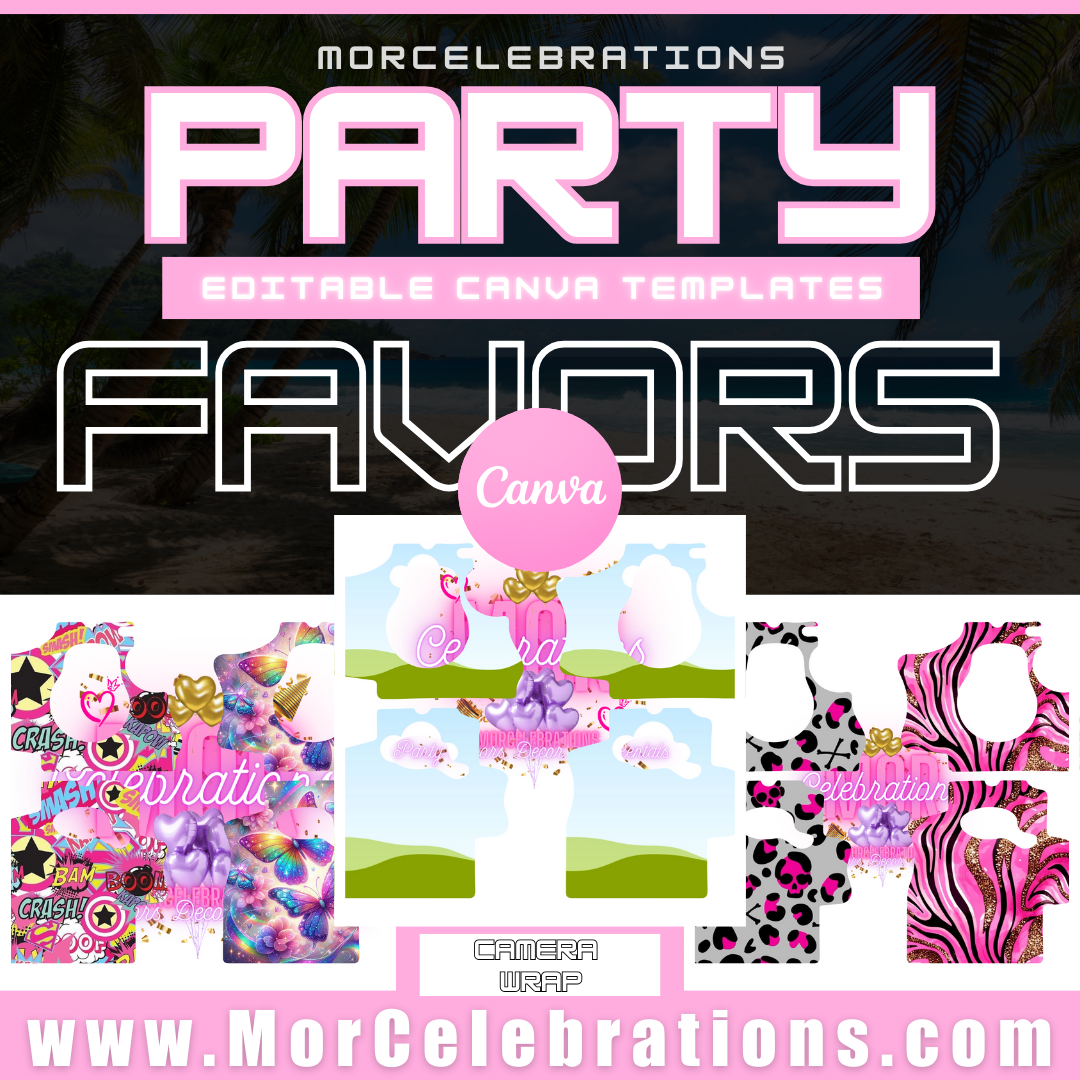 Elevate your parties with our customizable Blank Party Favor template at MorCelebrations, where we specialize in creating unforgettable moments. Our Disposable camera wrap template allows you to drop and drag your designs onto a Kodak Fun Saver Film camera, perfect for birthdays, weddings, graduations, or any event.