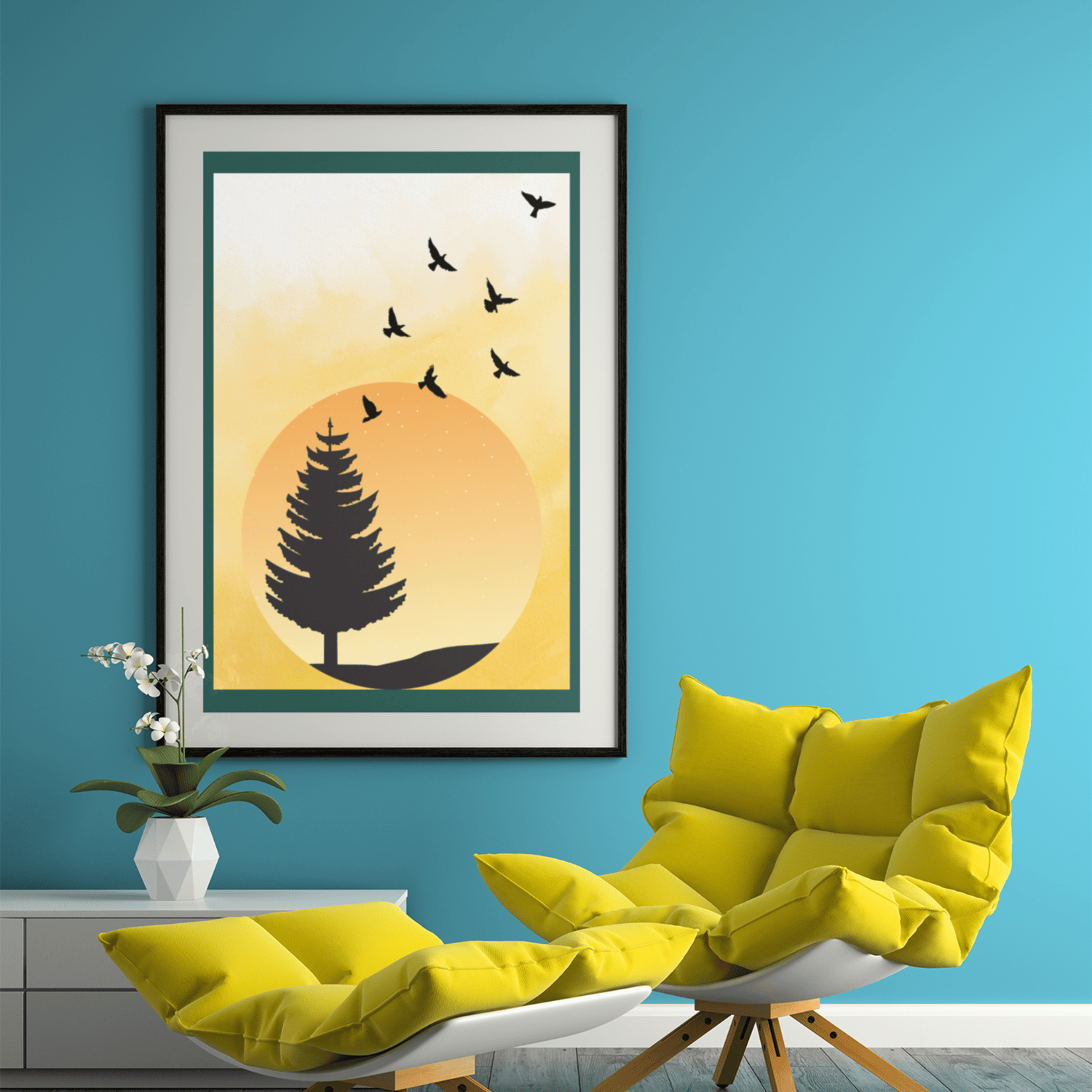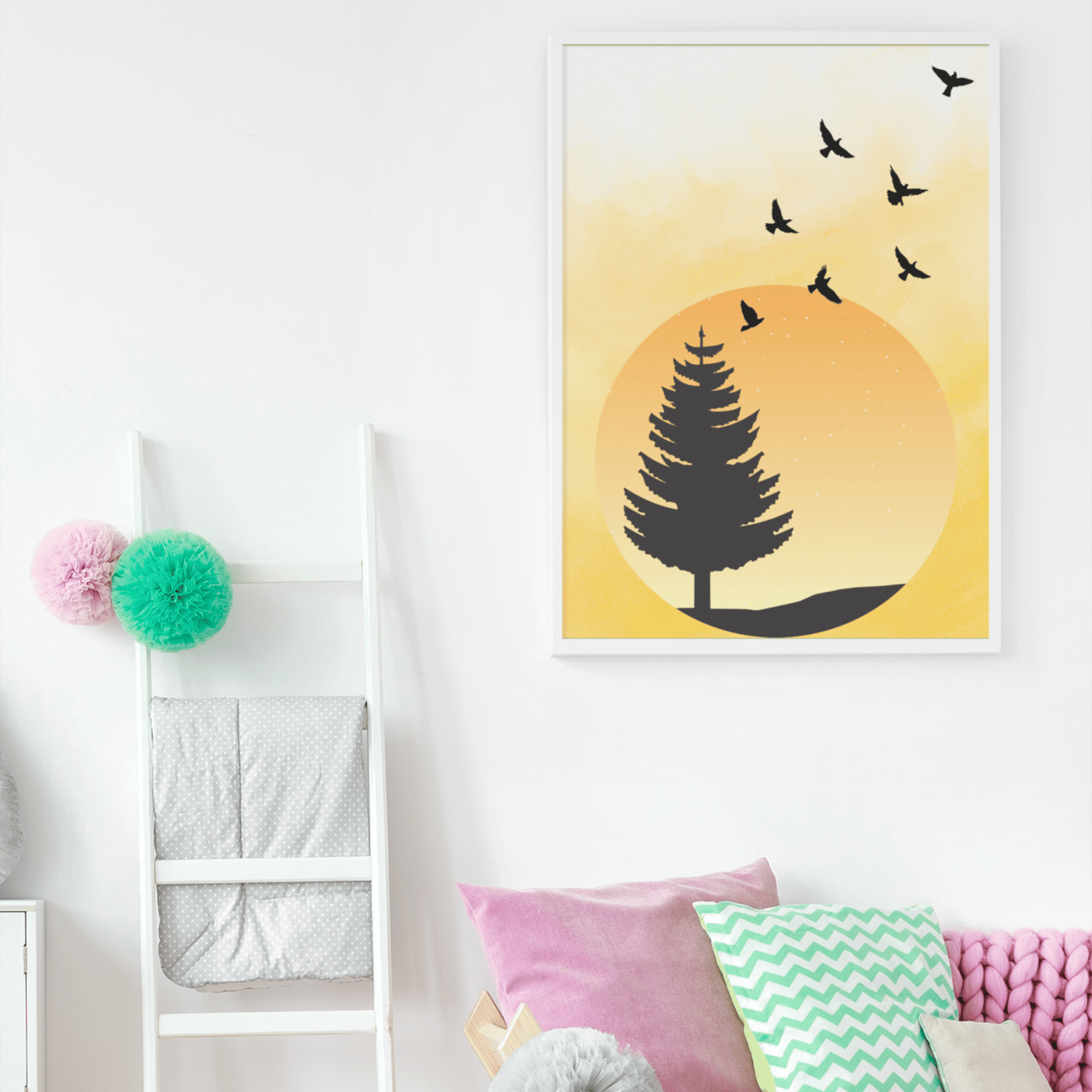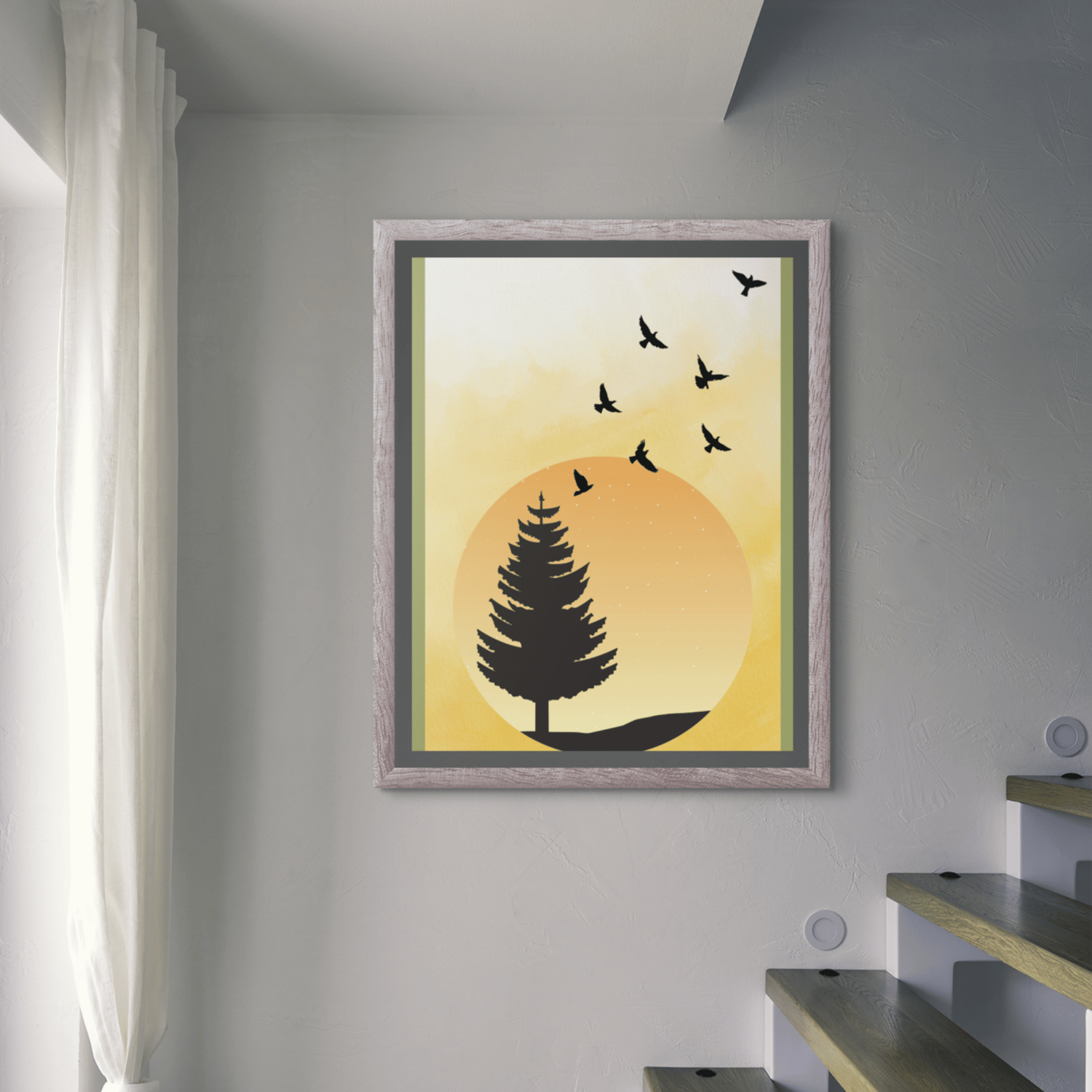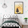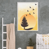 Bring warmth and serenity to your space with this Minimalist Sunset Nature Wall Art, featuring a soft yellow watercolor sky, a tree silhouette, and flying birds.