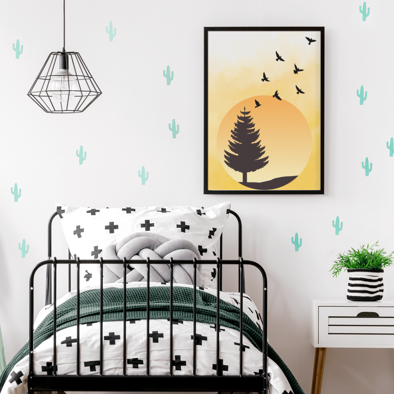 The calming color palette and simple nature illustration make it a beautiful addition to U.S. trending styles like: