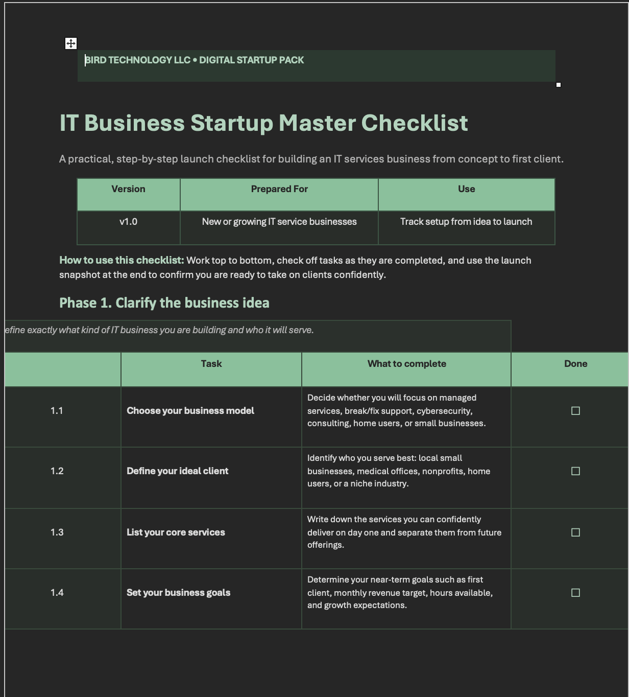 Start your IT business faster with ready-to-use templates, checklists, and startup documents.