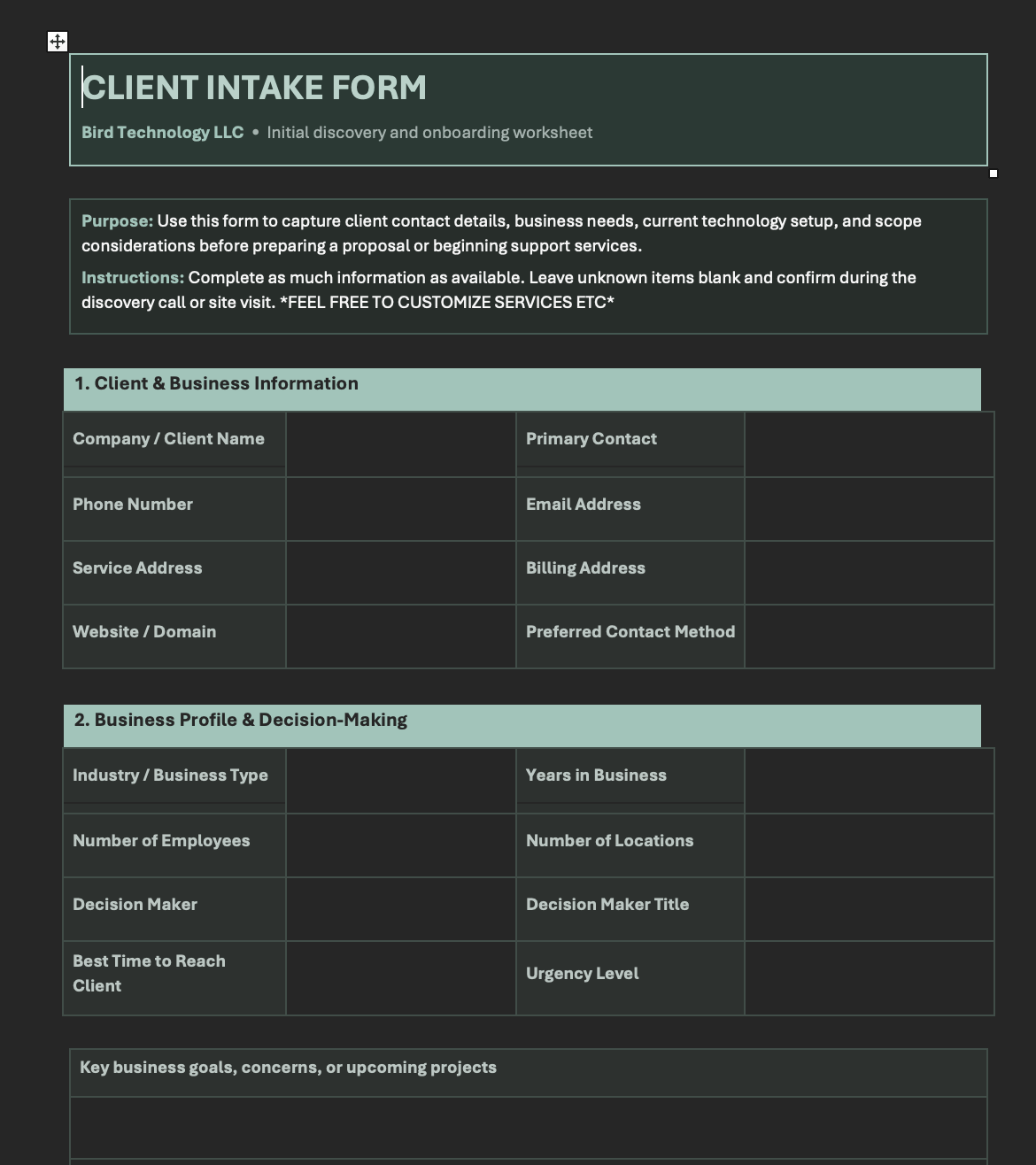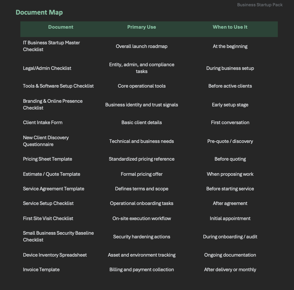 This pack is designed for aspiring IT support business owners, solo tech consultants, computer repair startups, and small managed service providers who want practical documents to help them get organized quickly.