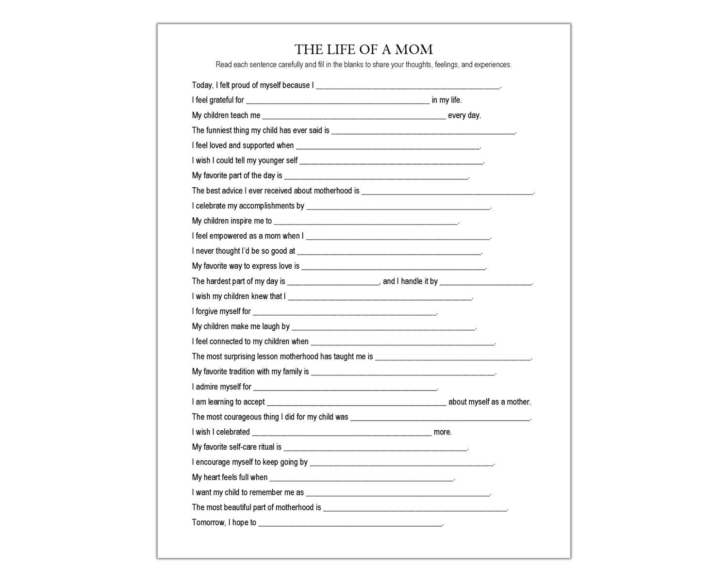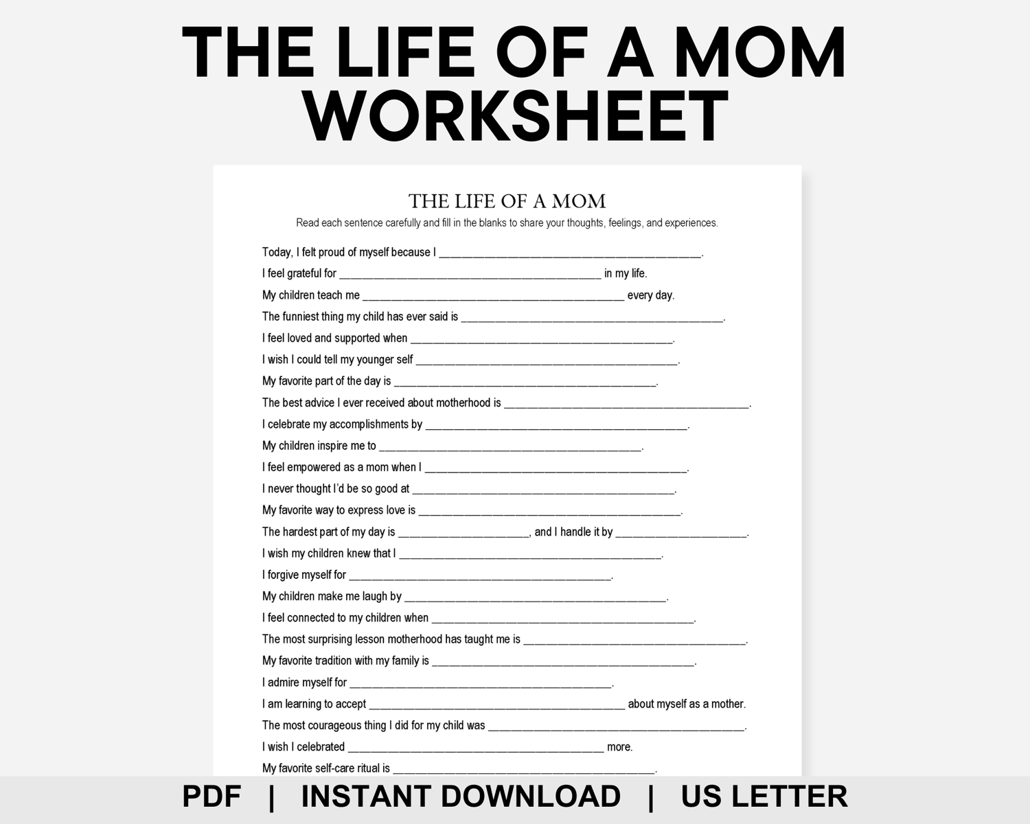 The Life of a Mom Worksheet, All About My Mom, Motherhood, Memory Journal, Gift for Mom, Mothers Day Gift, Parenting, Family Therapy