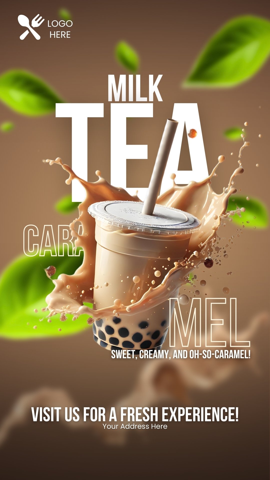 Sweet Creamy Caramel Milk Tea Digital Canva Template โ Customizable & Perfect for Your Brand ๐นโจ