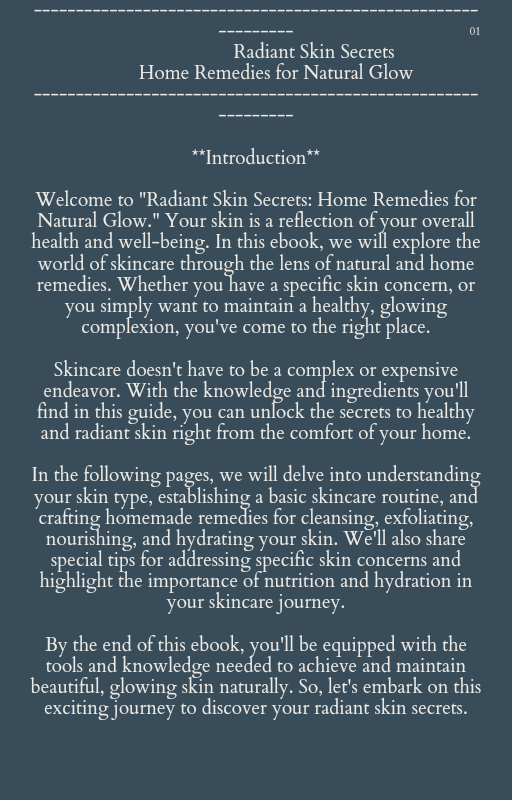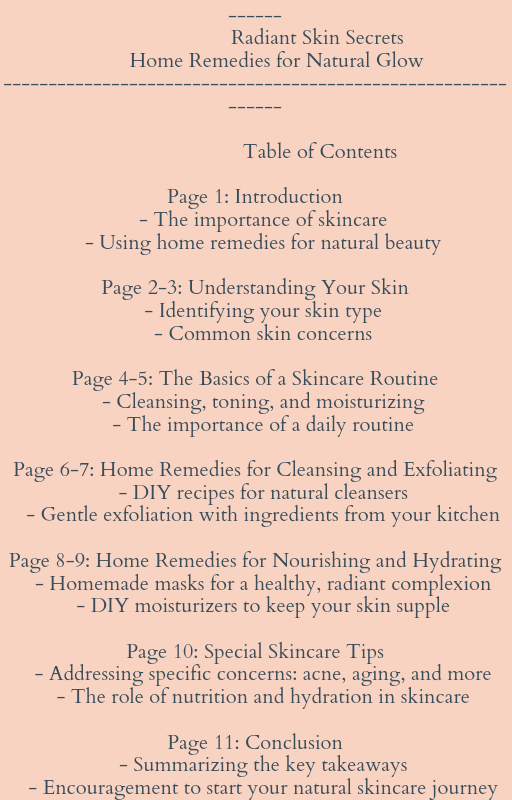 Discover the art of achieving radiant skin the natural way. Our ebook, "Glow Naturally," offers a comprehensive guide to skincare using home remedies. From understanding your skin type to addressing common concerns, embracing holistic practices, and maintaining a balanced lifestyle, this guide empowers you to unlock your skin's true potential. Explore homemade masks, DIY cleansers, and nourishing moisturizers while celebrating your unique beauty. Start your journey to radiant, healthy skin today!