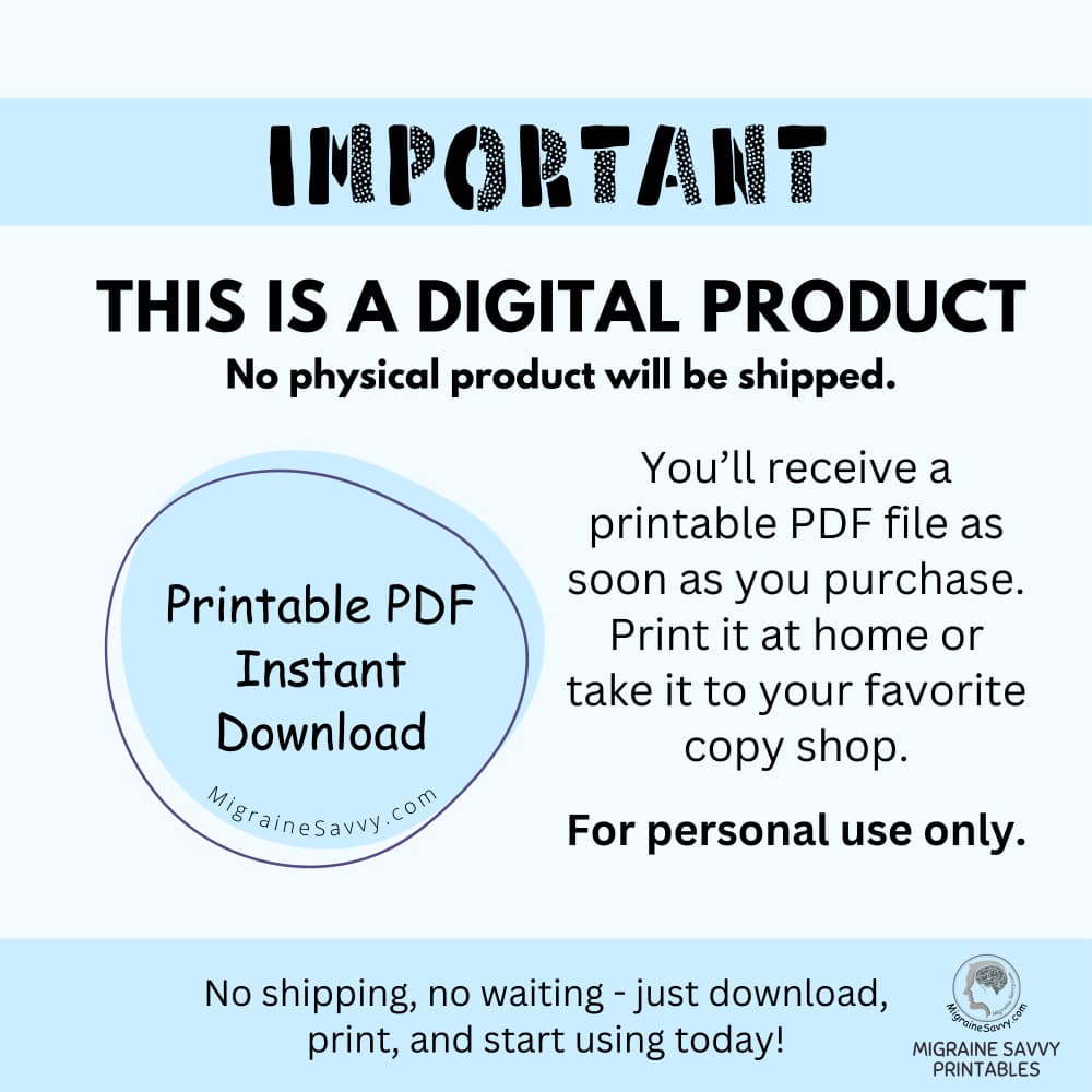 - All items purchased from MigraineSavvy.com are for personal use only. Digital files may not be shared, redistributed, or sold.