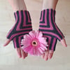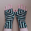 These fingerless gloves are knitted flat and in garter stitch stripes. They start with a provisional CO, is worked in short rows around the thumb and closed by grafting. The combination of stripes and short rows results in a striking geometrical pattern.