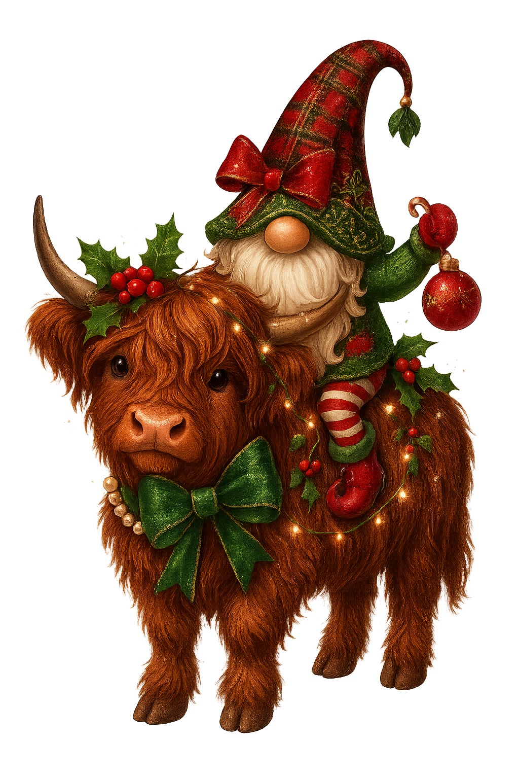 - A classic hidden-eyes preppy Christmas gnome, riding on the cowโs back, holding a glittering ornament and a small wrapped gift.
