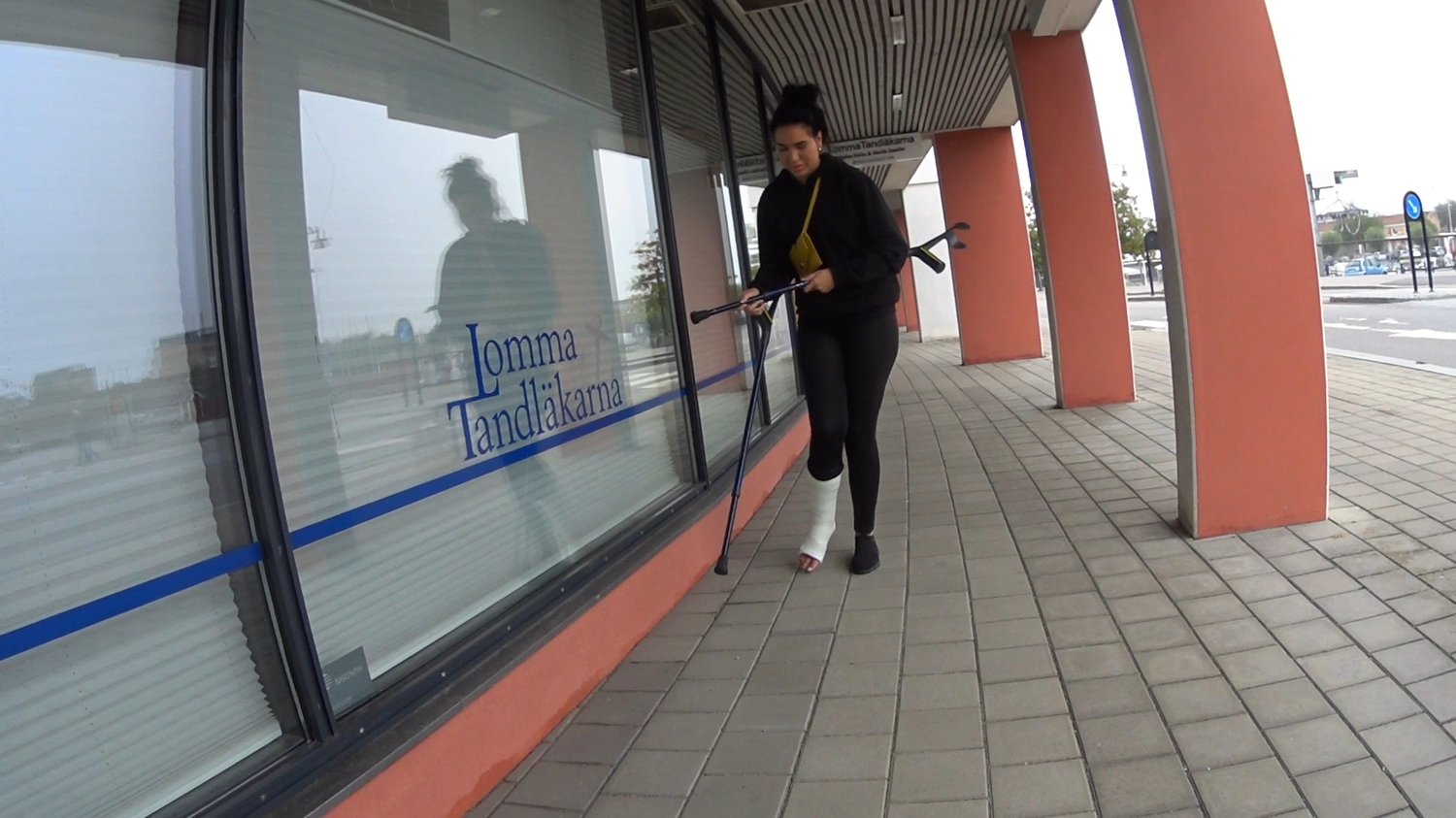Flower crutch across a street before stopping to adjust the height of her crutches.After some problems with one crutch, she continues into the neighborhood and down to the marina.After we filmed the Flowers cast, she continues along the water before crutching up a flight of stairs and across a street.