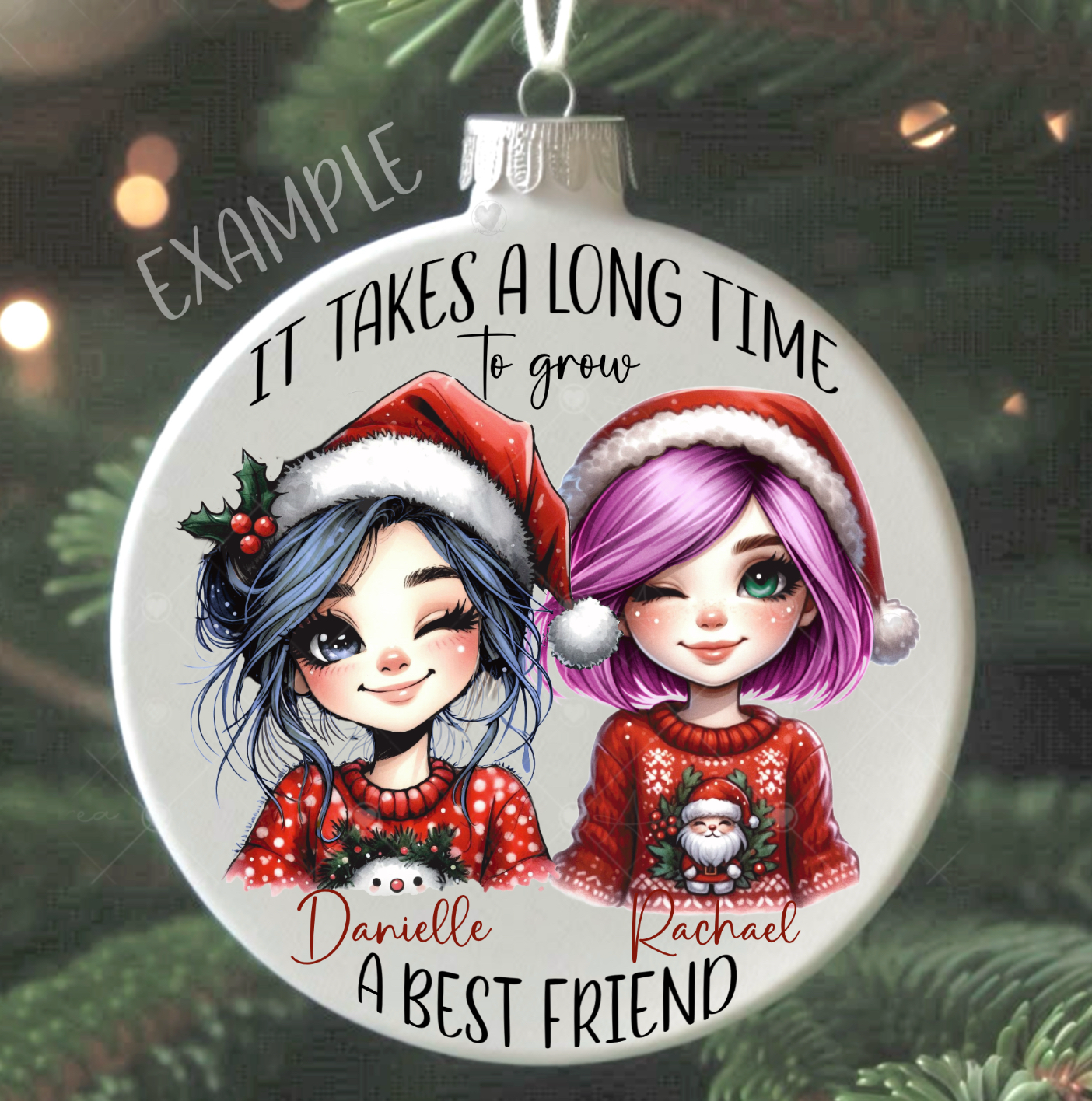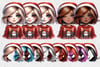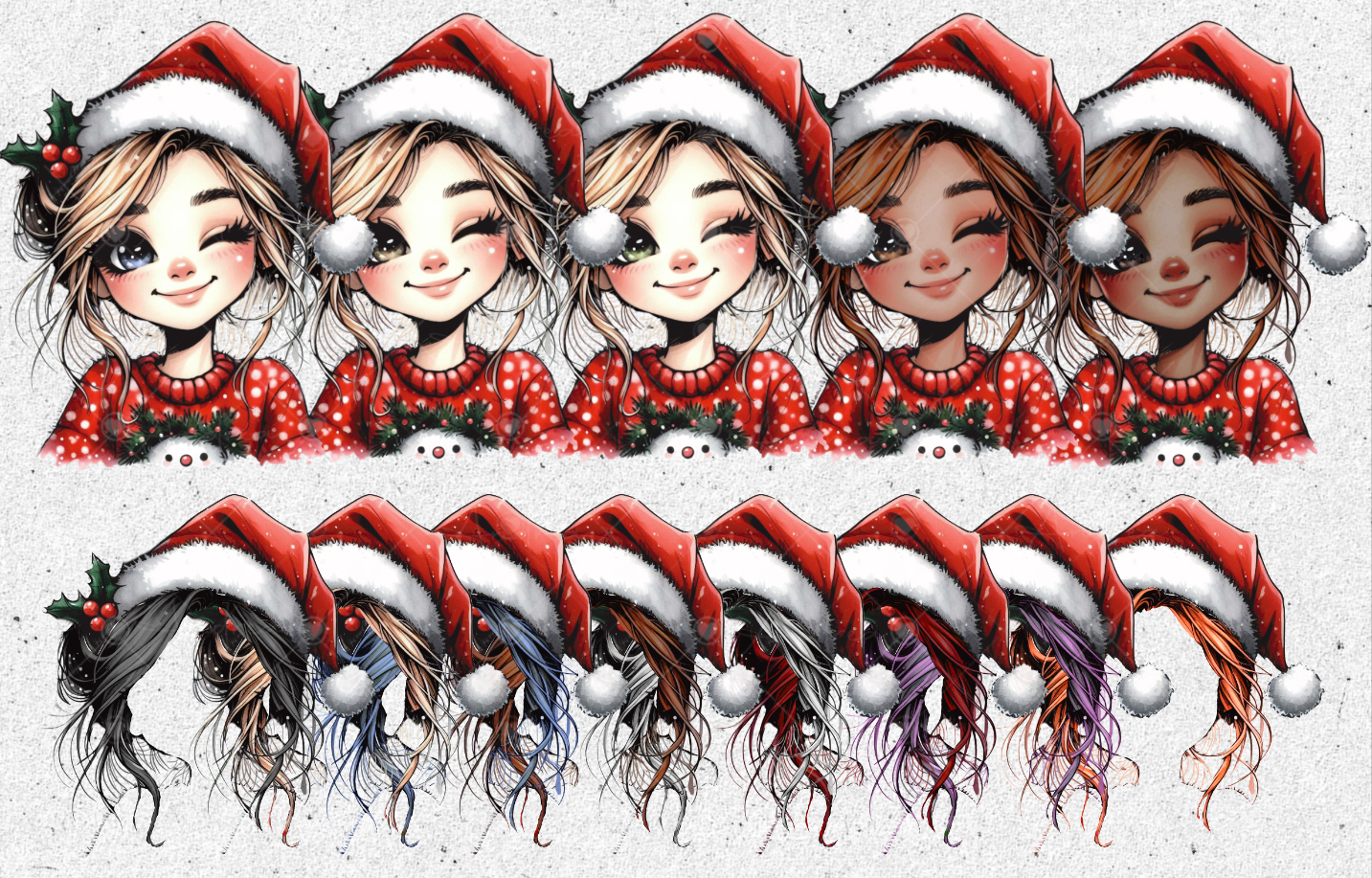 Chibi Christmas girl besties. 39 PNGs, hair, eye, skin colour options. Sublimation, print, design. Christmas PNG. Instant Download. 3 doll styles, all with blonde hair as standard and have blue, green and brown eyes and 2 darker skin options. Hair clipart with 8 different colours for each doll.