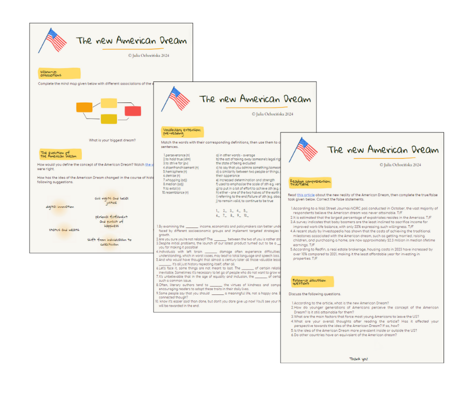 The main aim of this lesson is to bring the far-away American reality closer to your students, and most importantly – help them decide whether the American Dream is still a thing and whether it's still attainable for younger generations in specific.