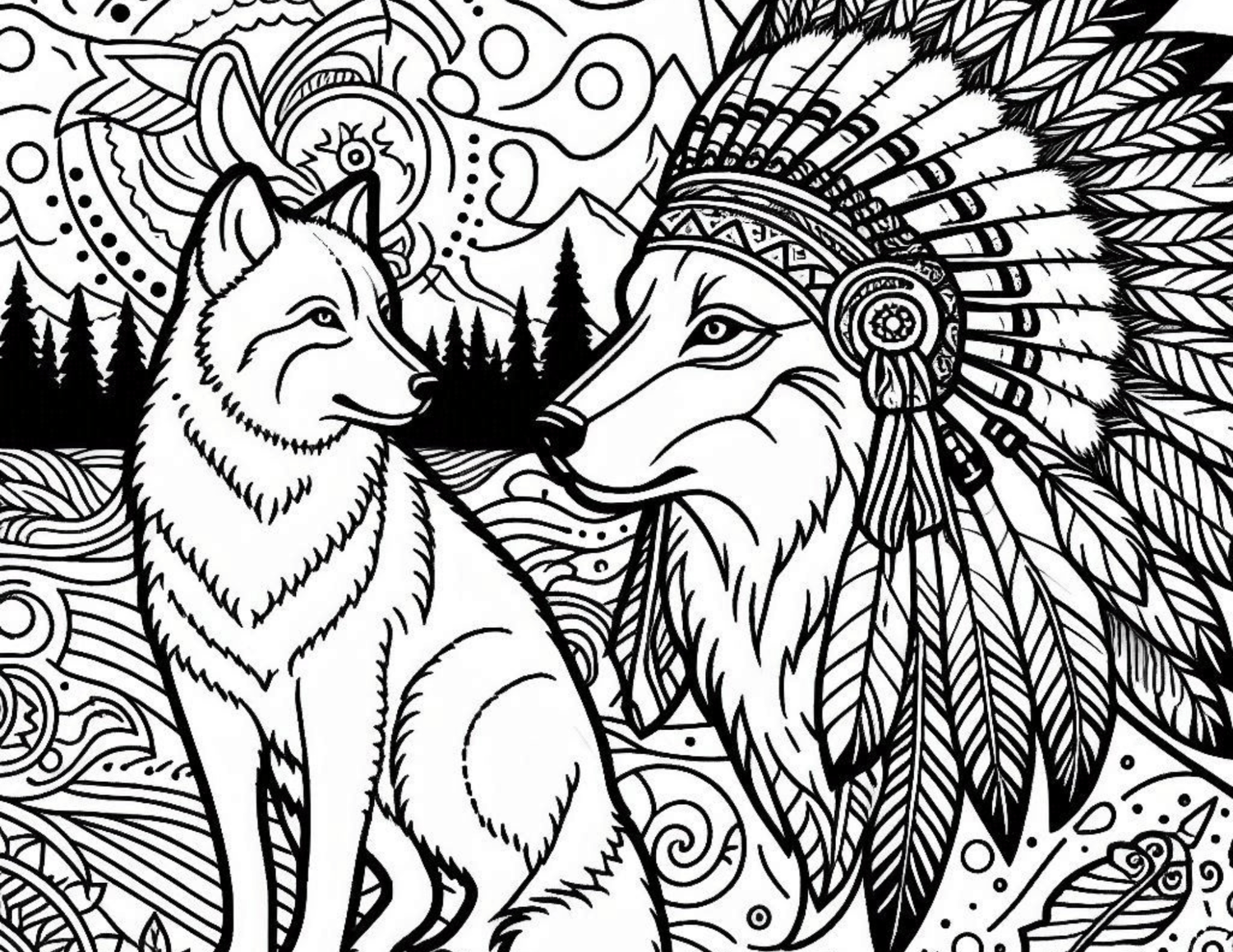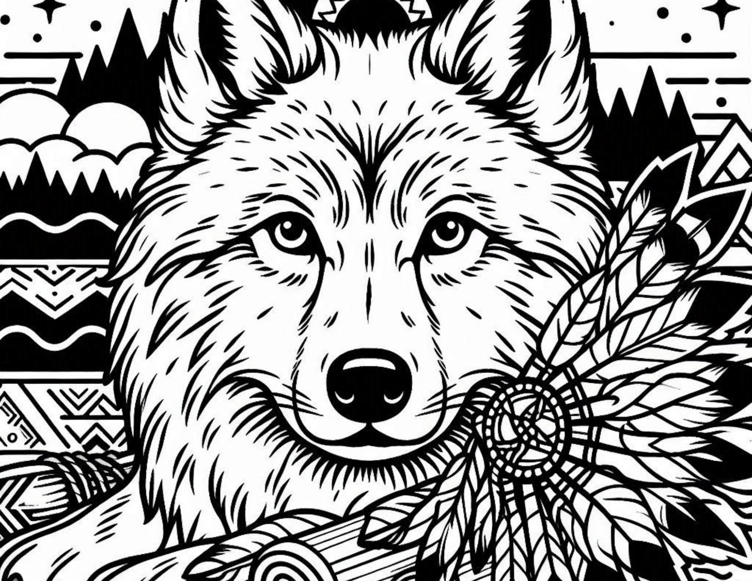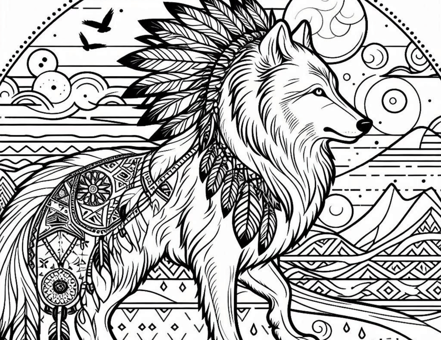 Native American Wolf Coloring Book 8 pages landscape print.