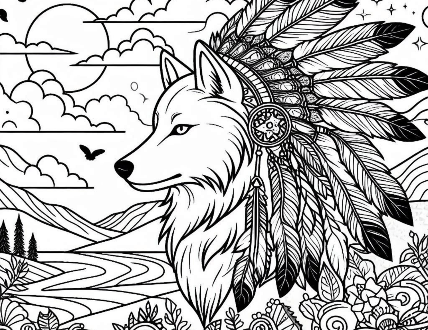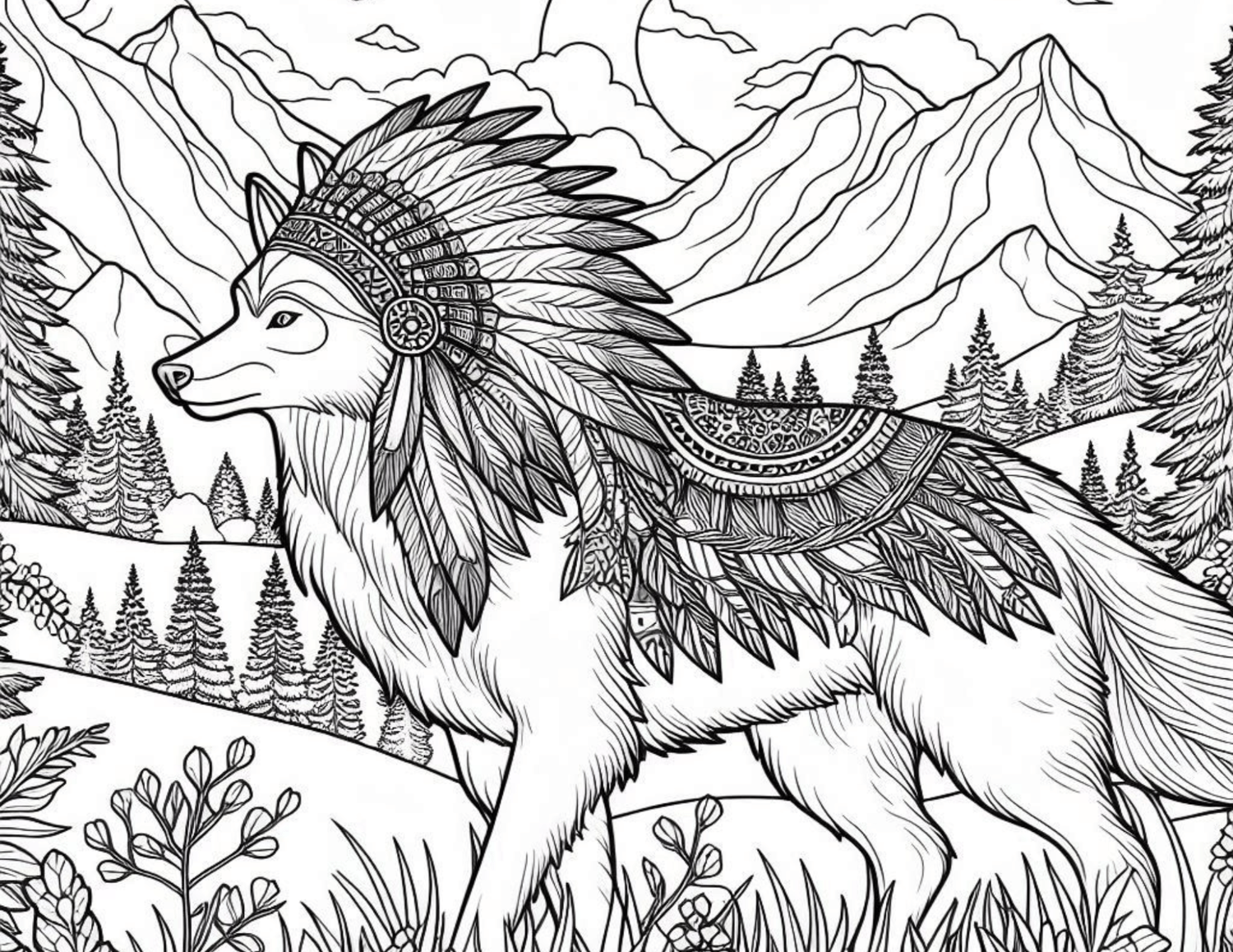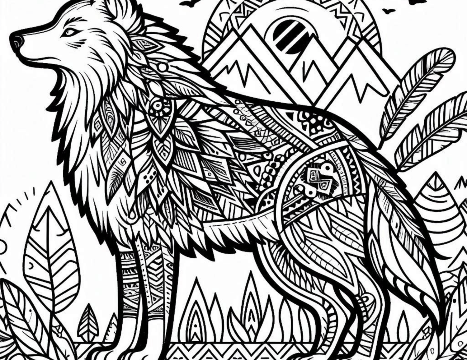 Native American Wolf Coloring Book 8 pages landscape print.