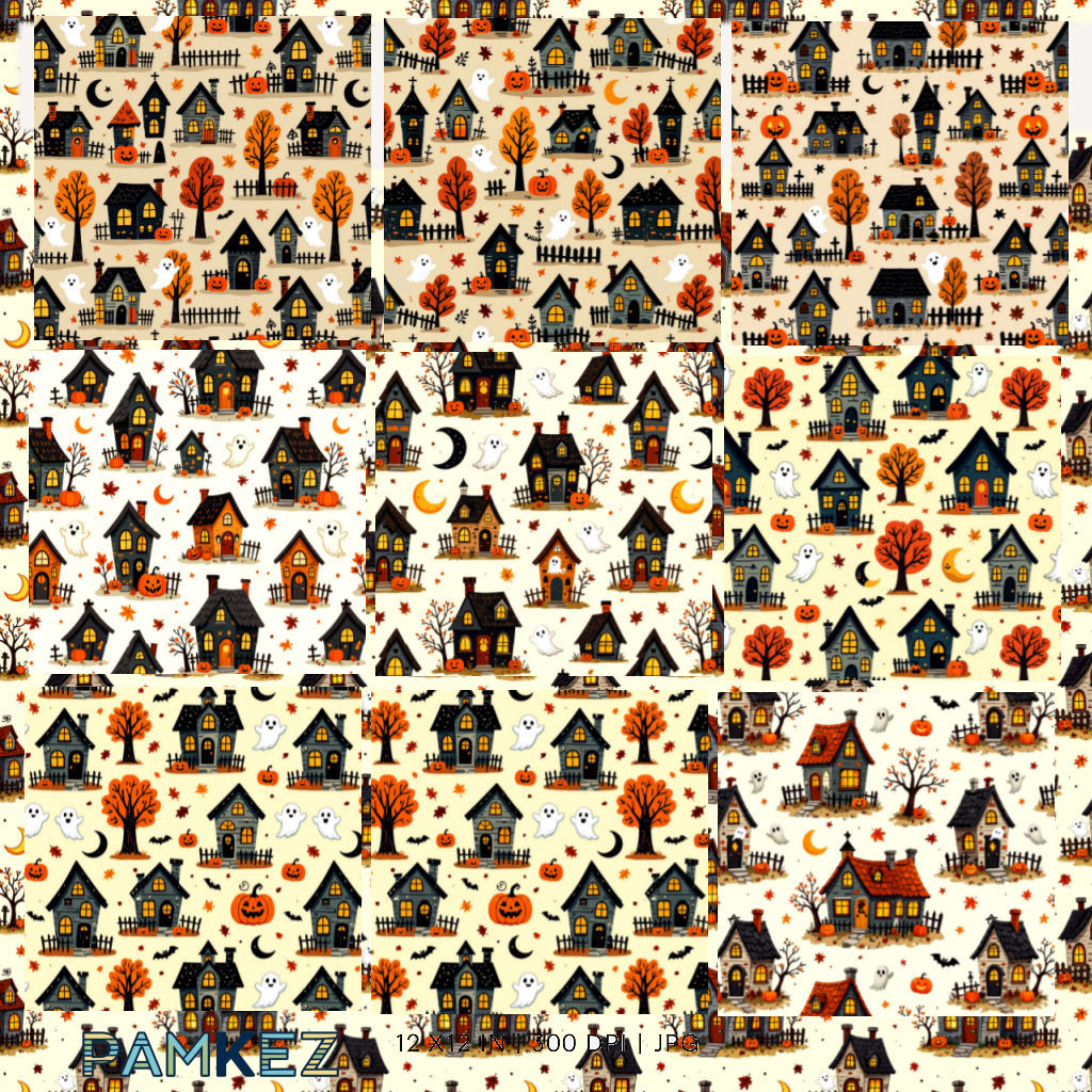 This set features a set of 10 12x12 inch whimsical haunted houses, glowing pumpkins, autumn trees, playful ghosts, bats, and crescent moons — all wrapped in warm fall tones of orange, black, and cream. Perfect for adding cozy yet spooky vibes to your designs.