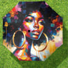 This umbrella features a dynamic and vibrant design, portraying a stunning Black woman with large, golden hoop earrings. Her face is a masterpiece of color, with bold, brushstroke-like patterns that blend various shades of red, blue, yellow, and purple. The artistic style gives the impression of a modern, abstract painting, capturing both the beauty and strength of the woman. Her expression is confident and poised, framed by a richly textured afro that seamlessly blends with the colorful background. This umbrella is a bold and expressive piece, perfect for those who want to make a statement with art and fashion.