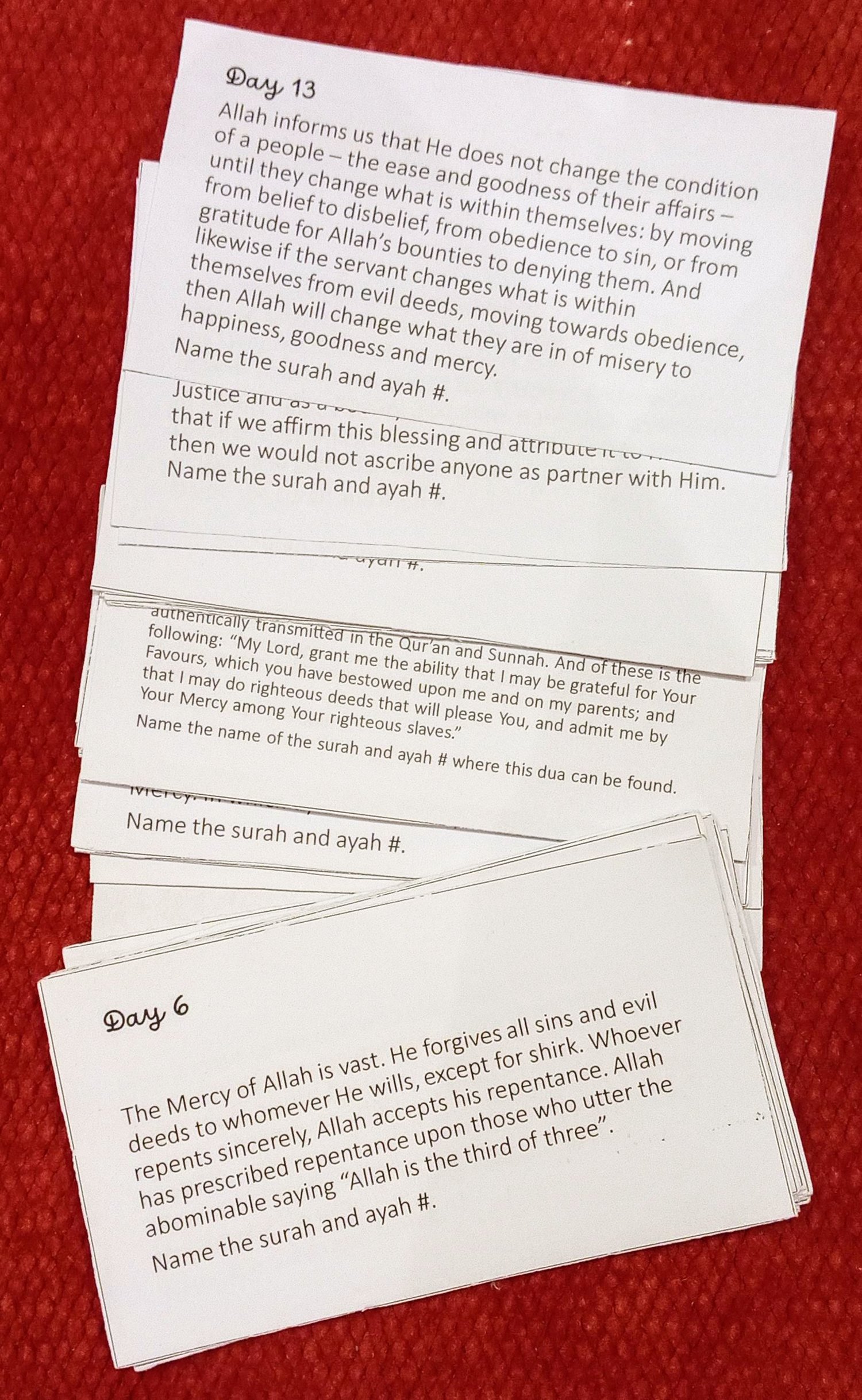 Each day there is one question prompt that relates to the corresponding Juz (so on Day 2, the answer will be found in the second juz, on Day 5 in the fifth juz and so forth).