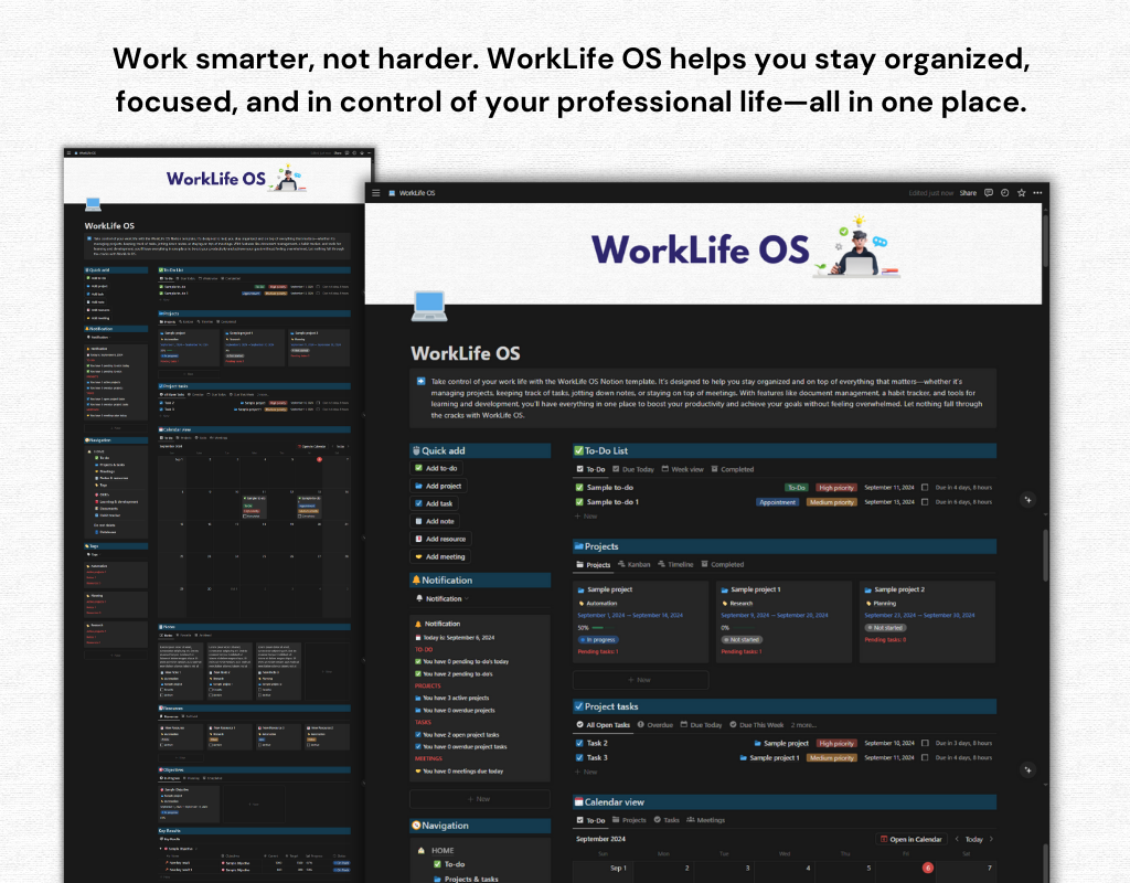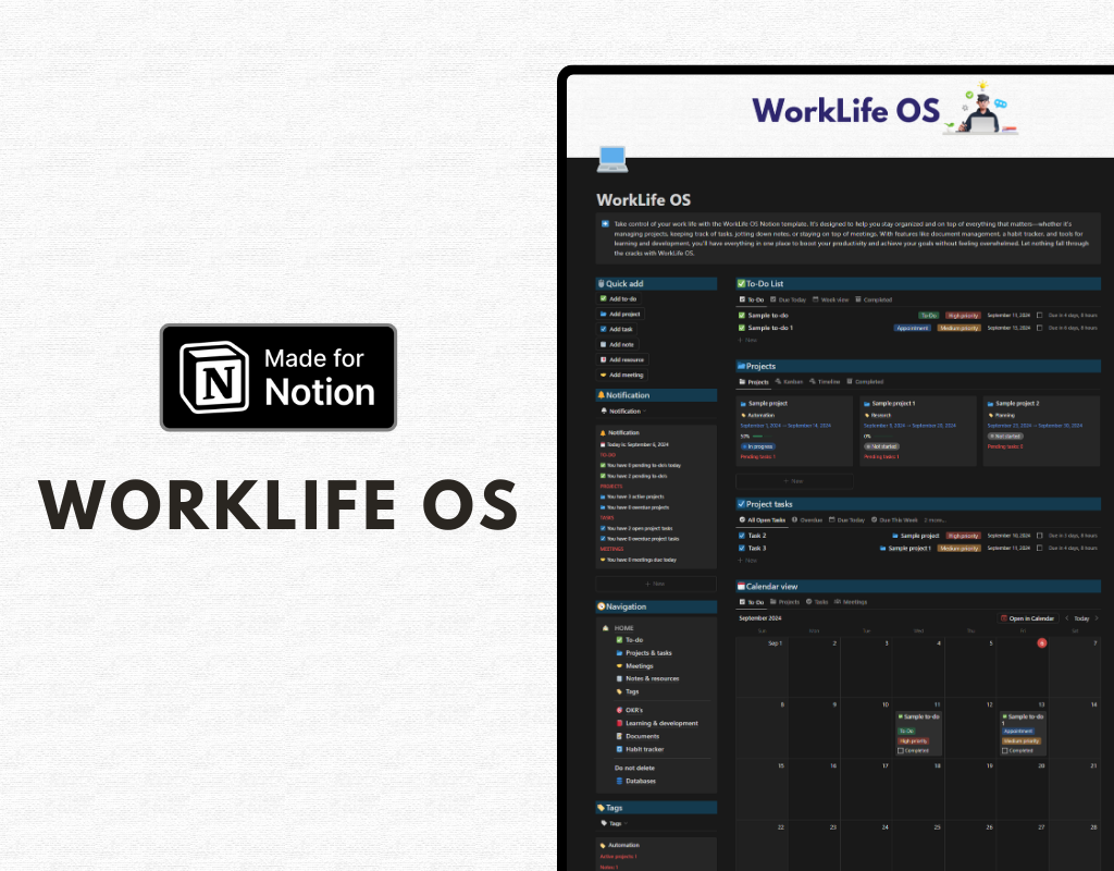 Welcome to WorkLife OS, your all-in-one workspace designed to streamline every aspect of your professional life and help you boost productivity. This comprehensive template has everything you need to manage projects, track tasks, store important documents, and support both your personal and professional growth.