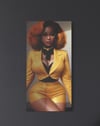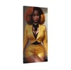 The golden hues of this piece evoke feelings of warmth and luxury, perfectly balanced by the commanding presence of the central figure. From her striking afro to her tailored suit dripping in retro elegance, every detail invites you to bask in her timeless confidence. This canvas transforms any space into a gallery of chic refinement, making it a must-have for art lovers with a taste for the extraordinary.