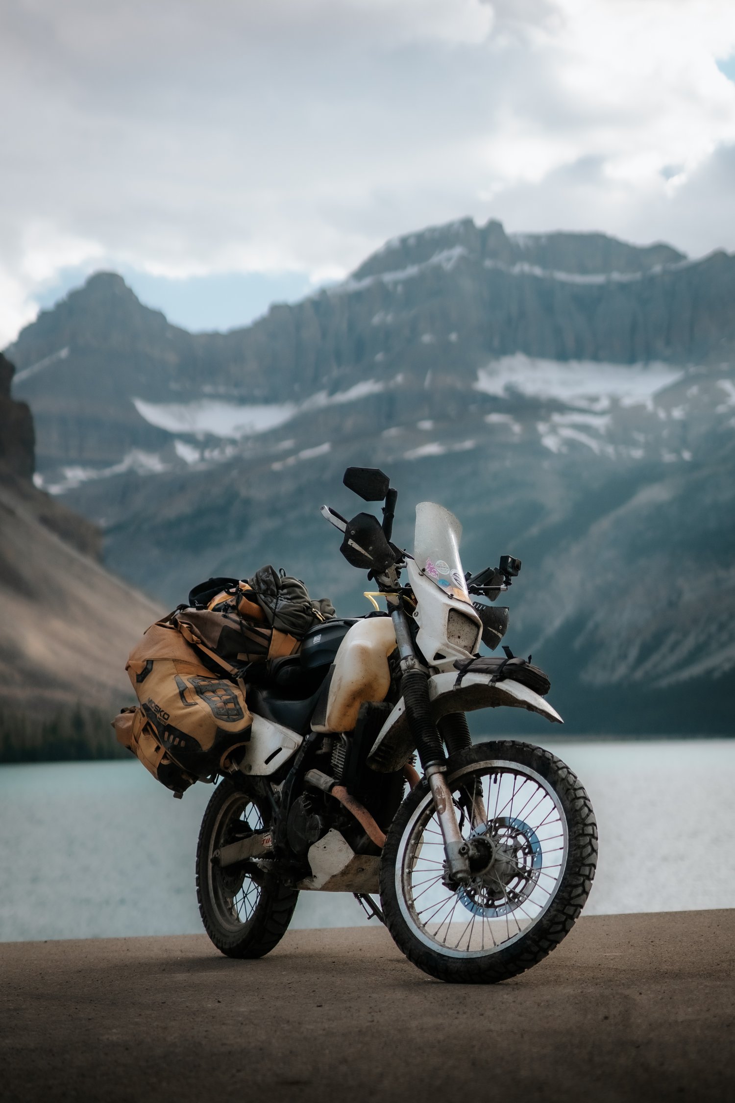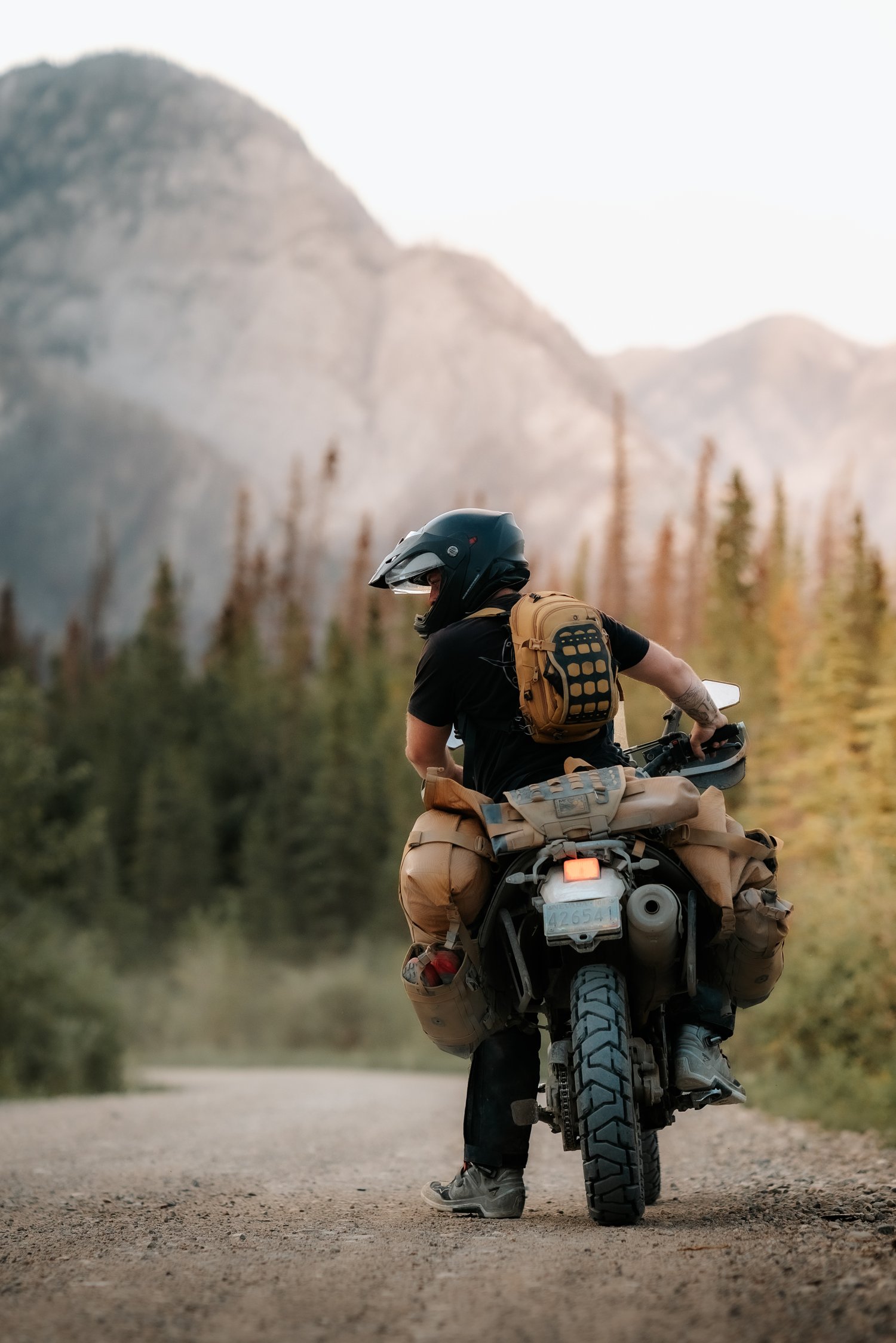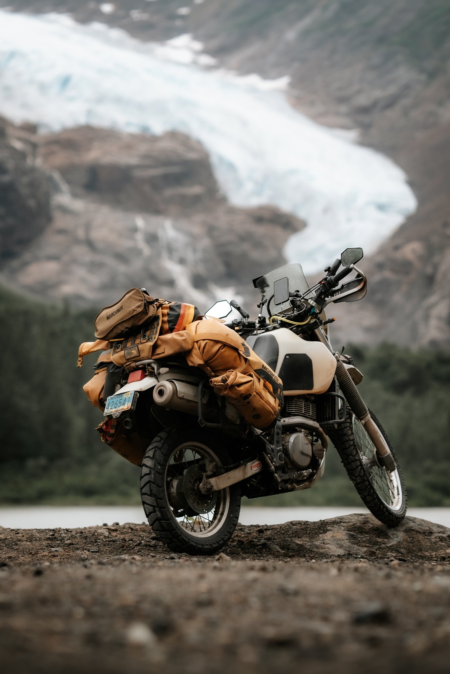 Adventure bikes, backcountry travel, wet-weather shots, expedition-style gear setups, glacial and forest landscapes
