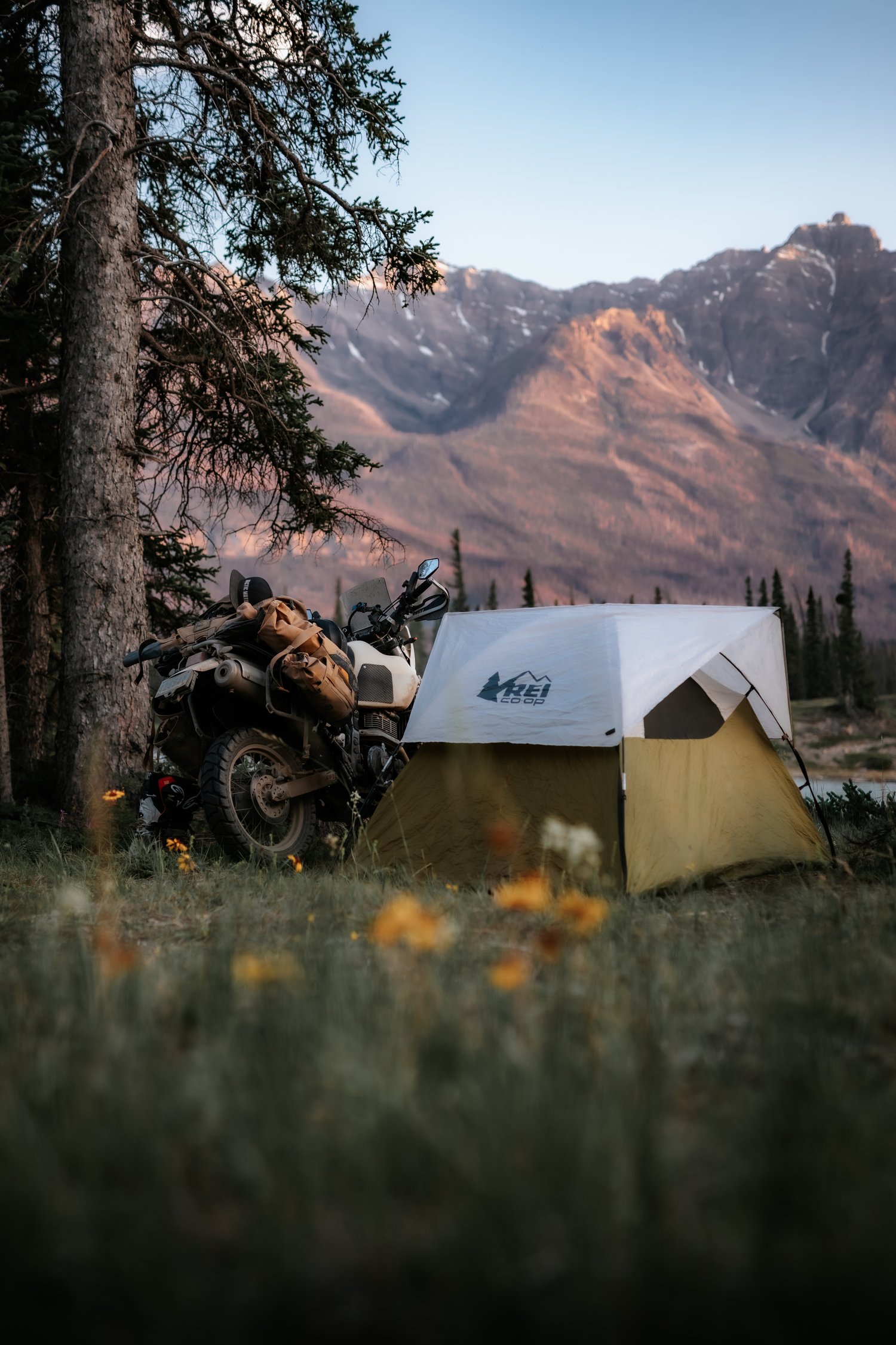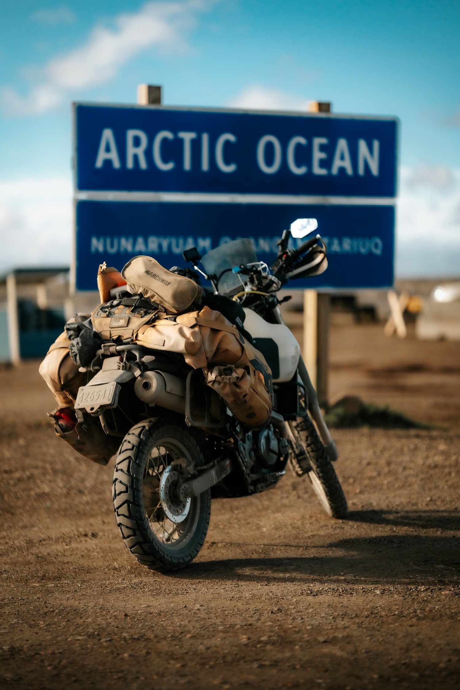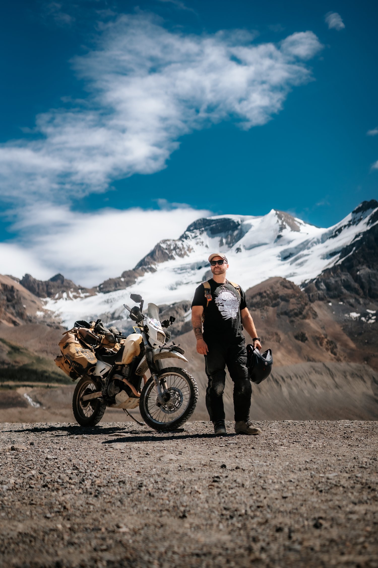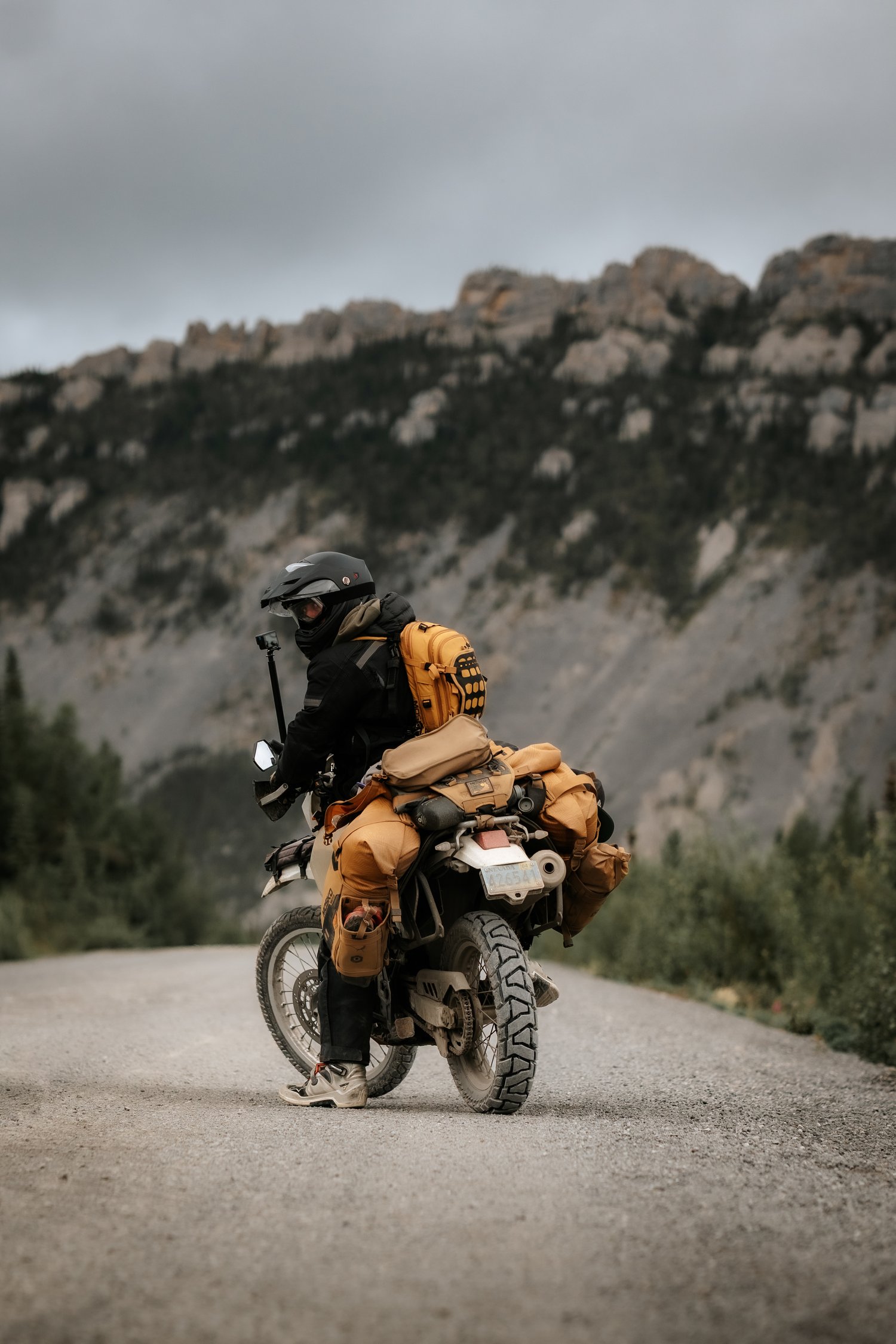 Adventure bikes, backcountry travel, wet-weather shots, expedition-style gear setups, glacial and forest landscapes