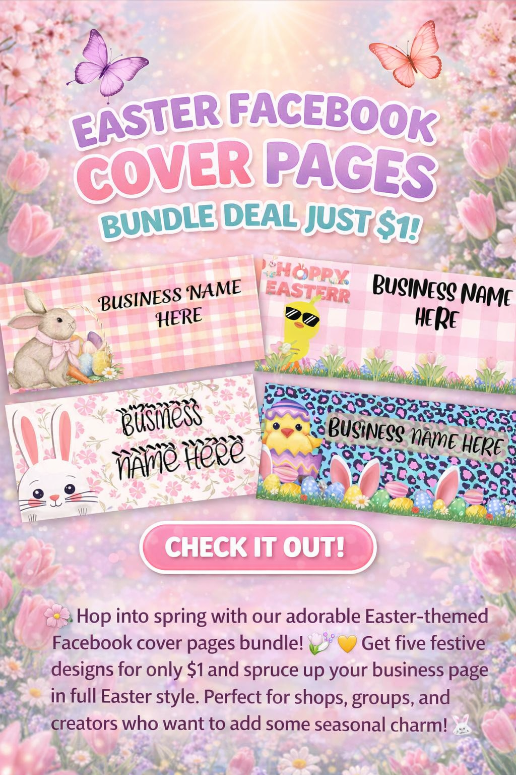 Spruce up your business page with this cheerful set of Easter-themed Facebook cover designs! πΈπ£ Perfect for shops, creators, and groups, this bundle includes 5 festive templates featuring bunnies, chicks, eggs, and pastel spring vibes β all customizable with your business name. Whether you're celebrating with a βHoppy Easterβ or simply adding seasonal charm, these covers are a fun and affordable way to refresh your online look.