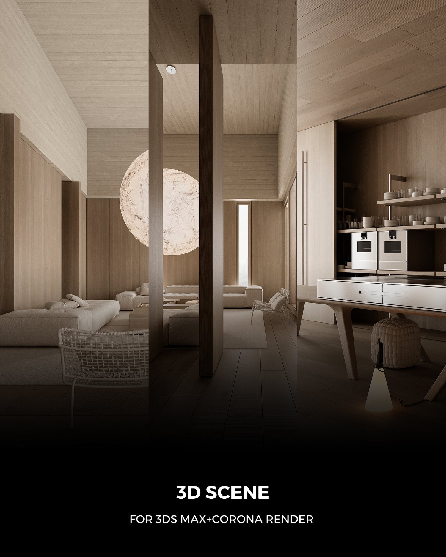 3D scene made in 3Ds Max + Corona Render, with customized lighting and materials. The scene is worked out and assembled with incredible detail, clarity and accuracy. Saved all lighting settings, textures, furniture details. This is an incredibly useful tool for designers and visualizers who want to improve their skills and level up their work in 3Ds Max 2018-2024 + Corona Render 8. Enjoy!