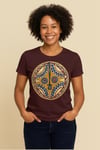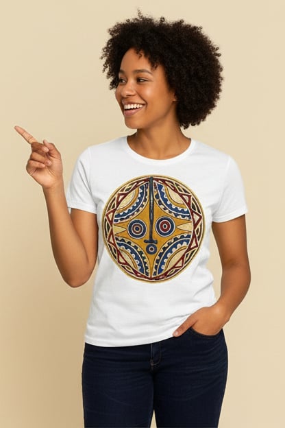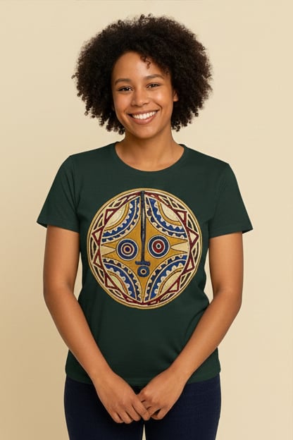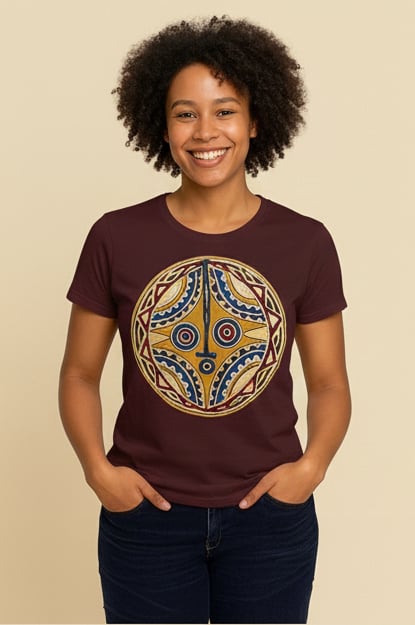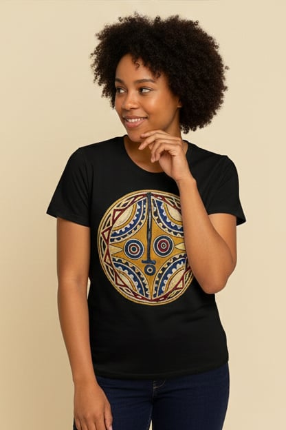 Ce t-shirt affiche le motif graphique d'un masque rituel traditionnel du Burkina Faso reconnaissable à son style géométrique pur et son contraste percutant.