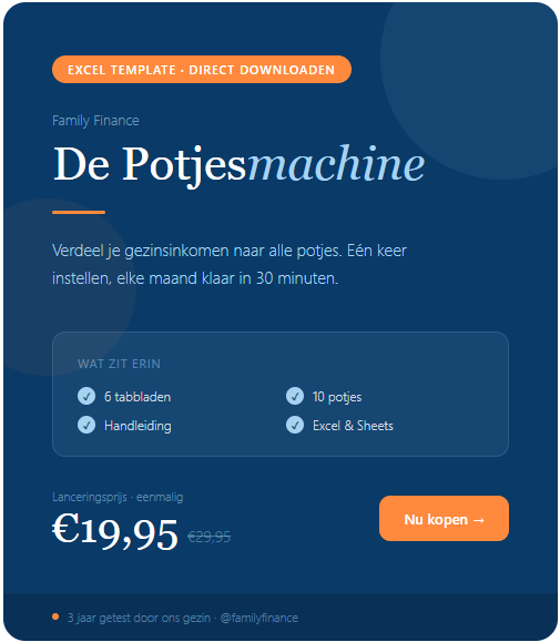 Verdeel je gezinsinkomen in één overzicht naar alle potjes. Geen bonnetjes bijhouden, geen eindeloos rekenen. Eén keer instellen, elke maand klaar in 30 minuten.