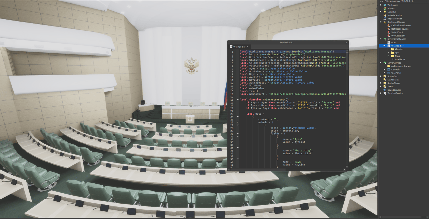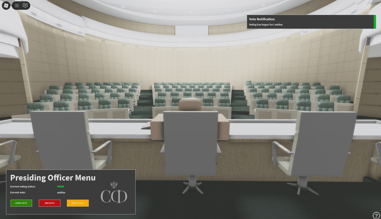 A realistic government roleplay featuring a scripted voting system, this experience lets players take on roles within the upper house of the Russian Parliament to propose motions, debate policies, and pass legislation. With functional voting and a detailed council chamber, it offers an immersive political simulation designed for realism, education, and strategic collaboration.