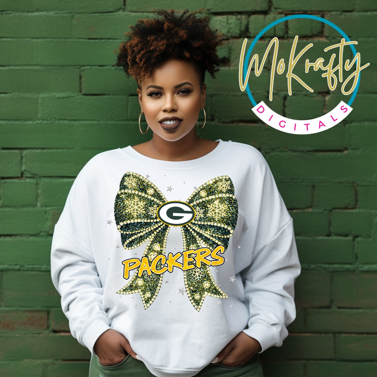 Bring full glam energy to game day with this sparkly rhinestone bow design featuring the Packers colors and mascot. Perfect for shirts, tumblers, hoodies, stickers, fans, and custom game-day merch.