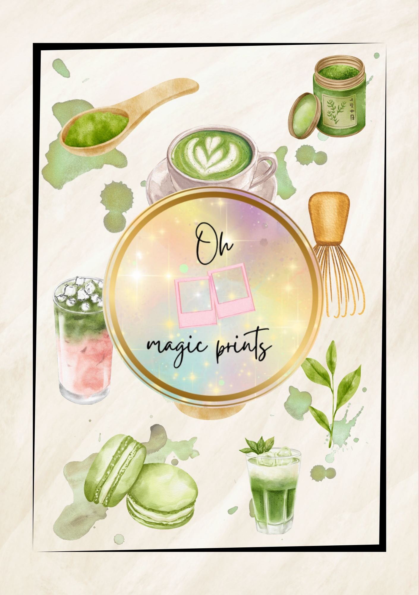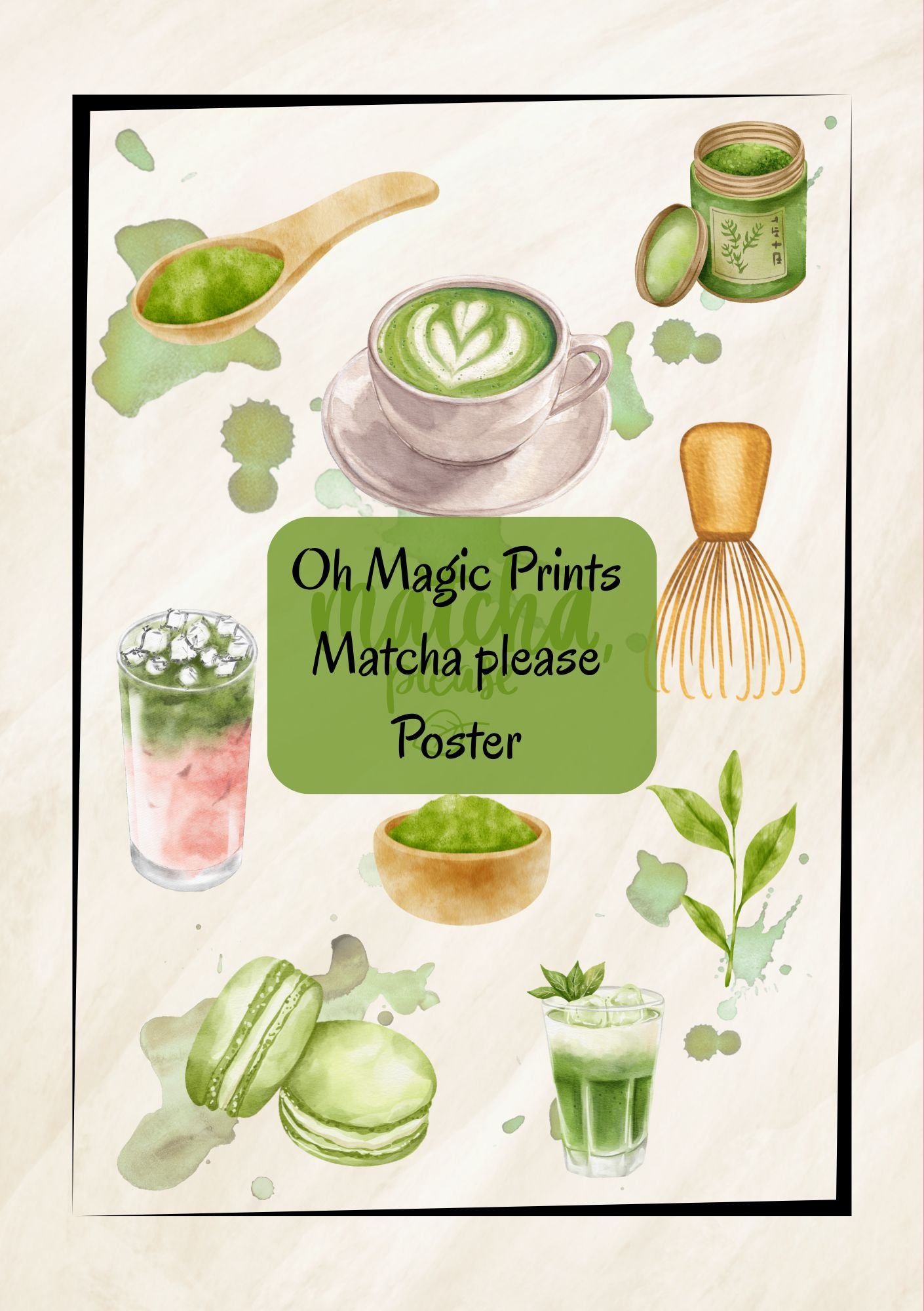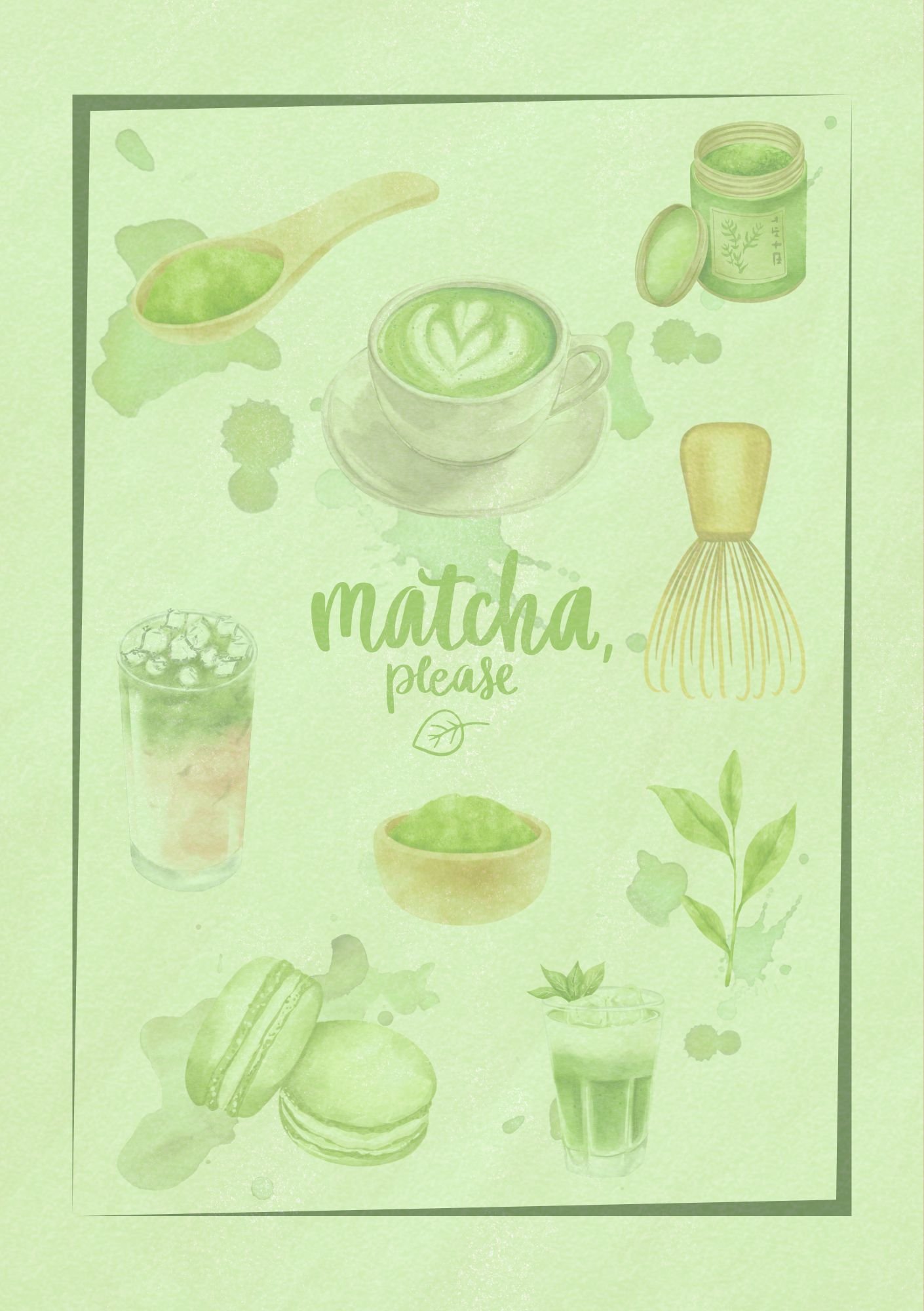Bring calm, creativity, and a dash of green goodness to your walls with this beautifully hand-painted matcha-themed poster! Featuring delicate watercolour illustrations of matcha whisks, lattes, macarons, tea leaves, and more — all centred around the playful quote “Matcha, please” — this print is a must-have for tea lovers.