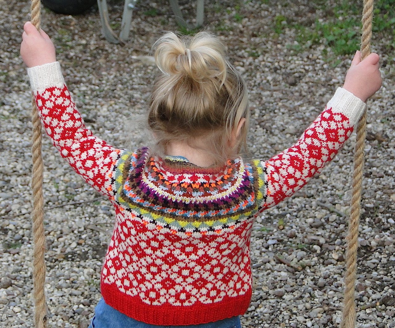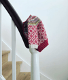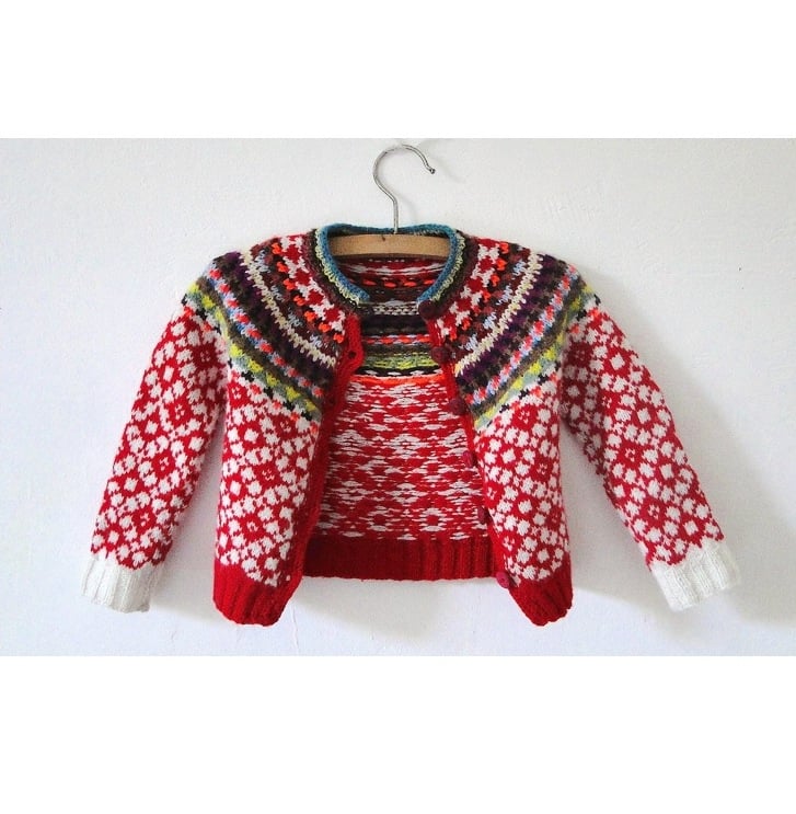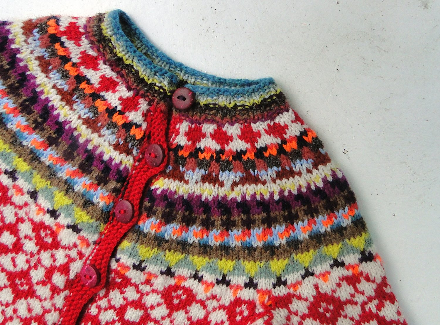 Inspired by a well-loved pair of mittens I bought in Sweden as a young knitwear student, this colourful cardigan has become one of my most popular made-to-order designs, and I have now adapted it for hand knitters, owing to high demand!