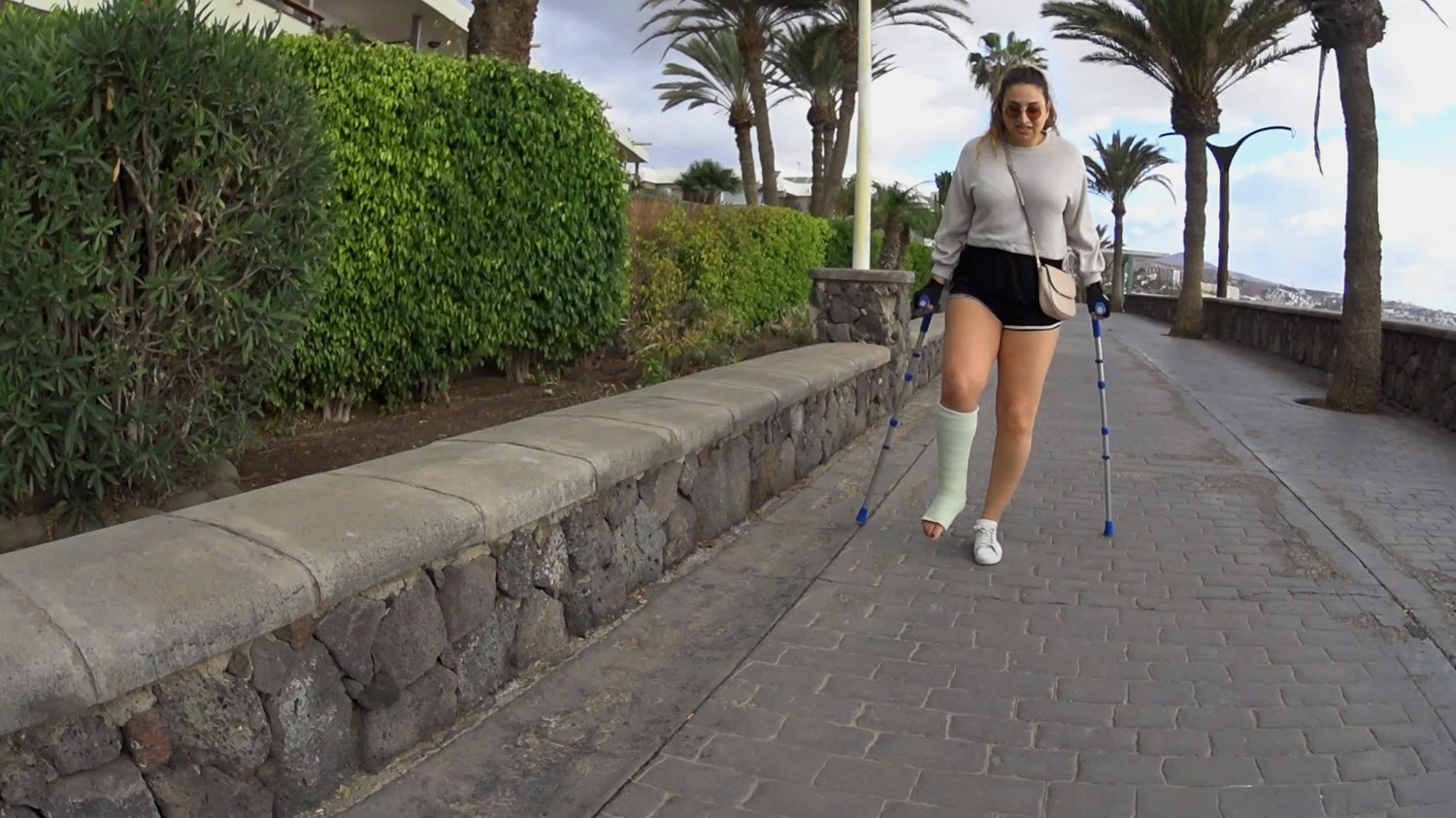 Penelope is at the moment crutching with a broken foot casted in a white SLC on her trip to Spain. She’s crutching towards the beach to admire the view, while she’s enjoying standing there for a while Penelope takes her chances to rest her casted leg as well. She lifts it up and puts it on one of her blue crutches as she small talks with the cameraman. A nice closeup of Penelope’s casted foot is done before she starts crutching again, she stick to the beachside and continues to crutch alongside with the water as she tries not to overwork her muscles and makes sure to take small and gentle steps. Suddenly she feels that her shoe is a little loose so Penelope crutches to the side to retie her shoelace. She gets back up afterwards and continues to crutch on the same sidewalk as the sun shines over her.