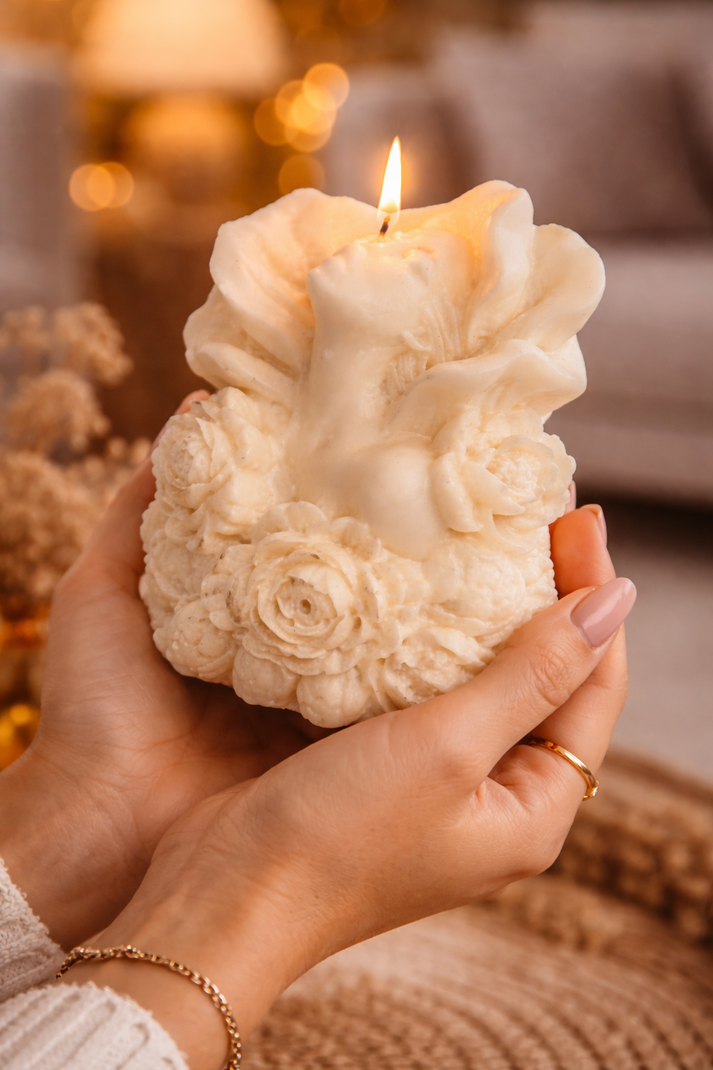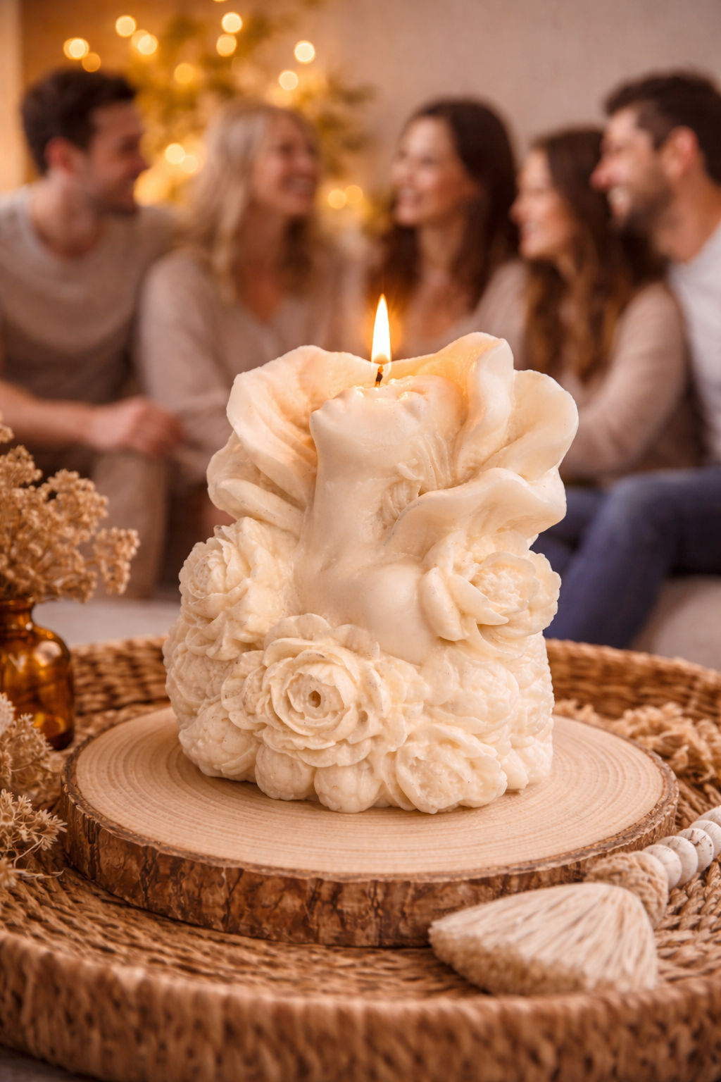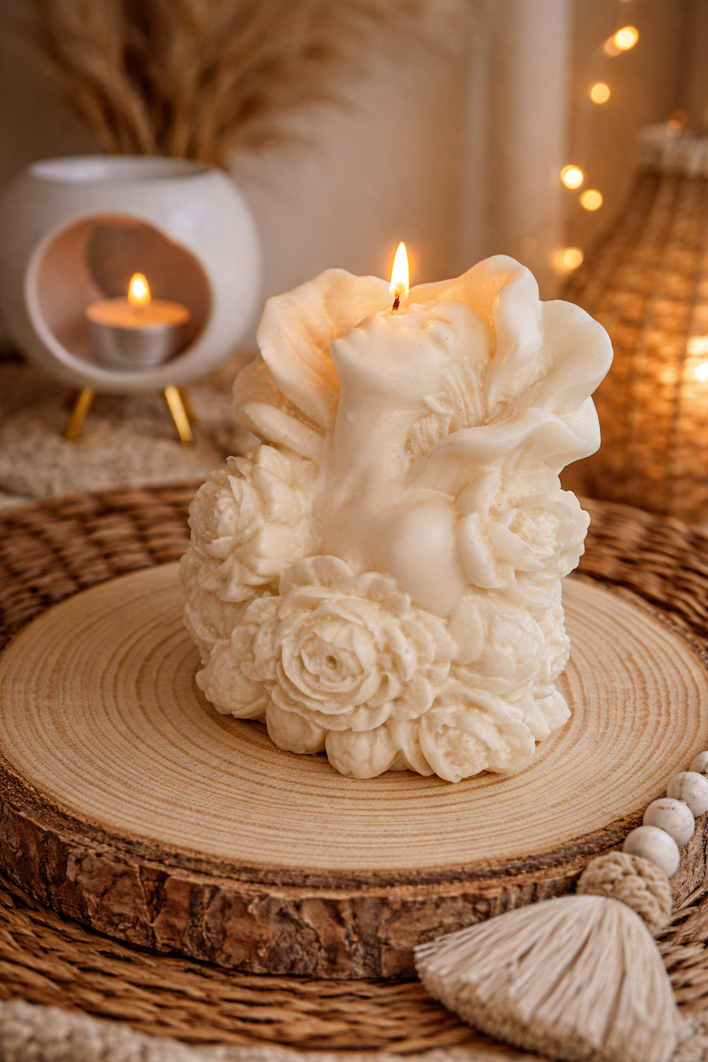 Κάθε κερί είναι 100% χειροποίητο, φτιαγμένο με προσοχή στη λεπτομέρεια και αγάπη για την αισθητική. Η απαλή του απόχρωση και η κομψή υφή των λουλουδιών το κάνουν ιδανικό για boho, minimal ή φυσική διακόσμηση.