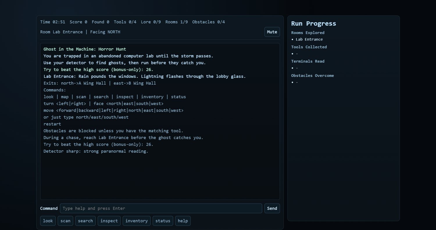 Ghost in the Machine is a text-based horror exploration game where you’re trapped in an abandoned computer lab during a storm, using a detector to track hidden entities before time runs out. You navigate by cardinal direction and facing, collect tools, uncover terminal lore, map every room, and escape frantic ghost chases through obstacle-filled routes. Your final score combines ghost finds with completion progress, and players who fully clear tools, lore, rooms, and obstacles unlock a Secret Victory ending with unique music.