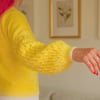 - The folded neckline, hem, and cuffs are worked in two-color brioche.