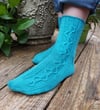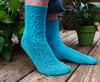 The cabled socks are knit from the top down with a heel flap and gusset. Right and left socks are mirror images of each other. Both written instructions and charts are included for the detailed sections of the pattern.