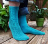 “What shall we do with the drunken sailor, early in the morning?” These nautical-themed socks were inspired by the Drunken Sailor song. They have a ‘drunken’ cable and some ‘rigging’ running down the front, and ‘whitecaps’ sloshing around on the back.