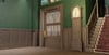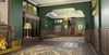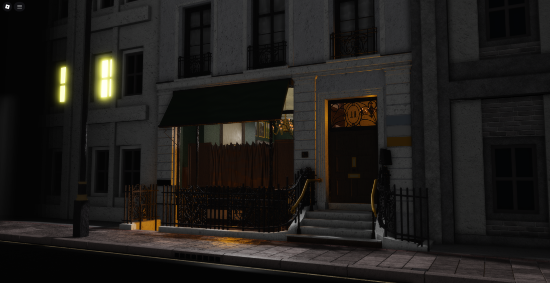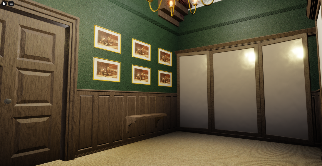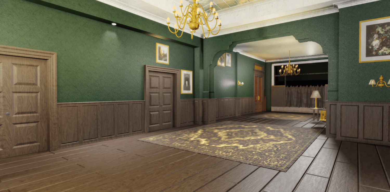 An elegant vintage hotel lobby featuring rich green walls, dark wood wainscoting, and ornate golden chandeliers. Detailed interiors include patterned rugs, framed artwork, antique furniture, and classic staircases with warm ambient lighting. The exterior showcases a moody nighttime street entrance with period-appropriate storefronts. Multiple connected rooms and hallways create an immersive old-world atmosphere. Perfect for mystery games, horror experiences, 1920s roleplay, detective stories, or cinematic showcases.